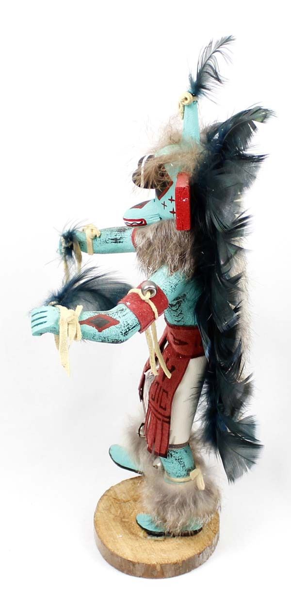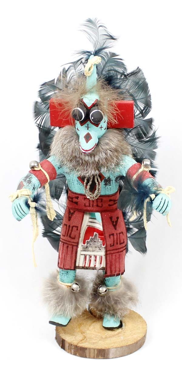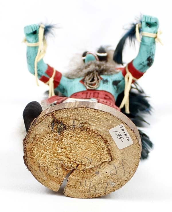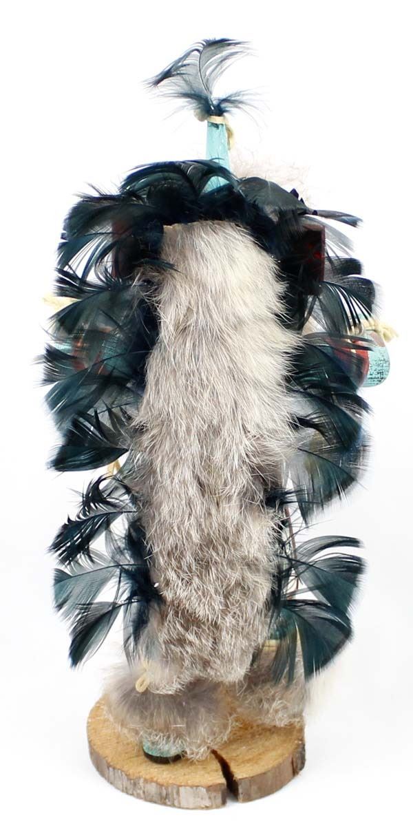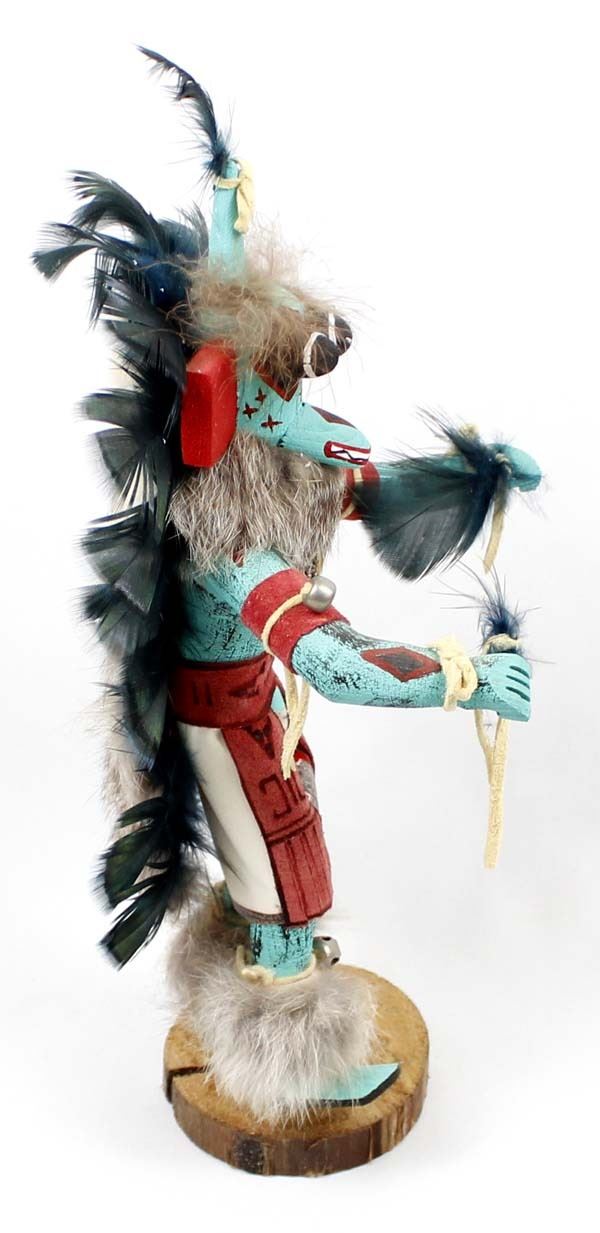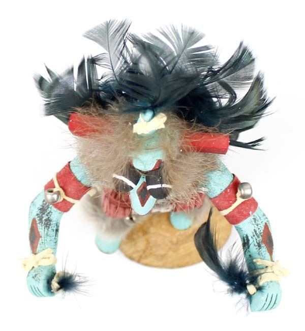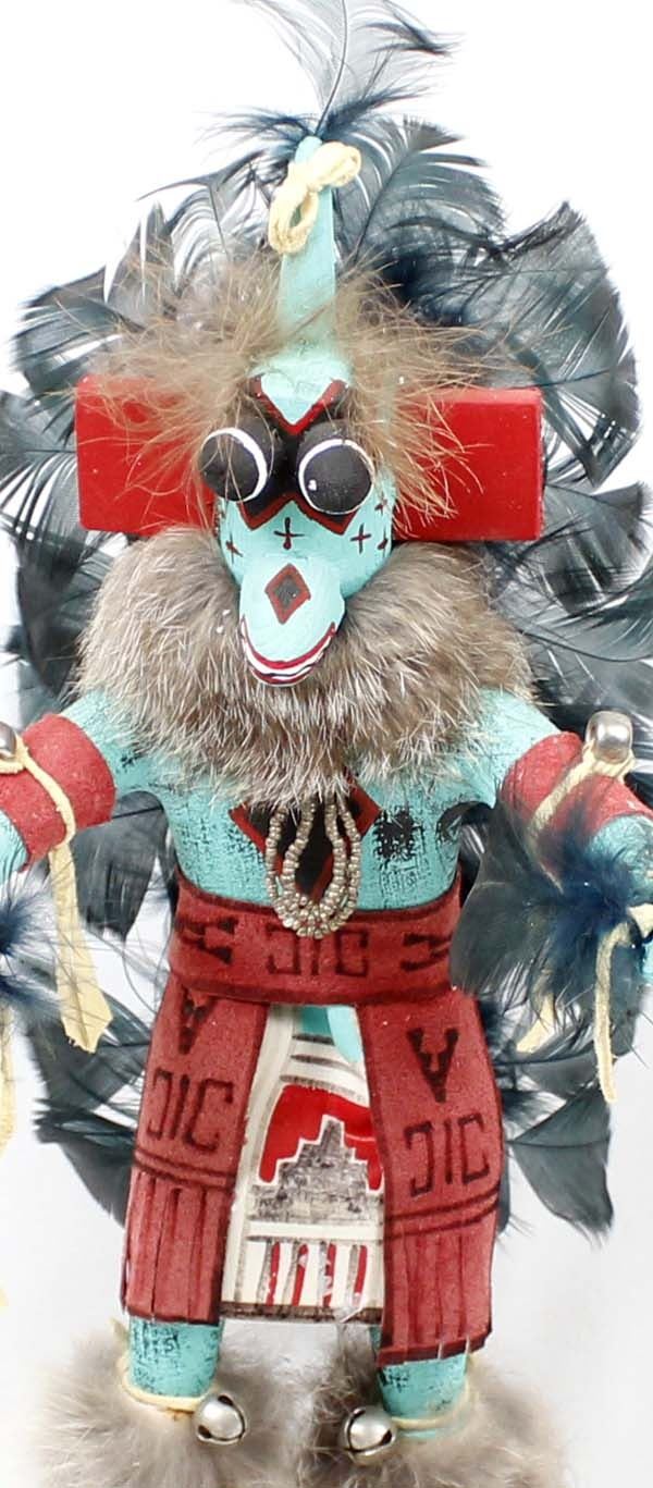 1997 Native American Navajo Kachina by Valcina BlueEyes, measures 5'' x 12'' x 4'' and is signed on the bottom, embellished with rabbit fur, bells, beads, leather, and feathers