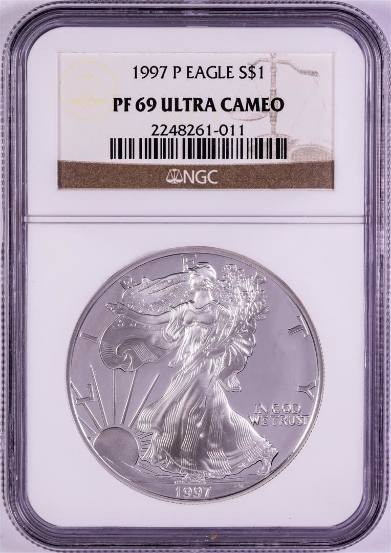 One 1997-P $1 Proof American Silver Eagle Coin NGC PF69 Ultra Cameo. NGC Certified.
