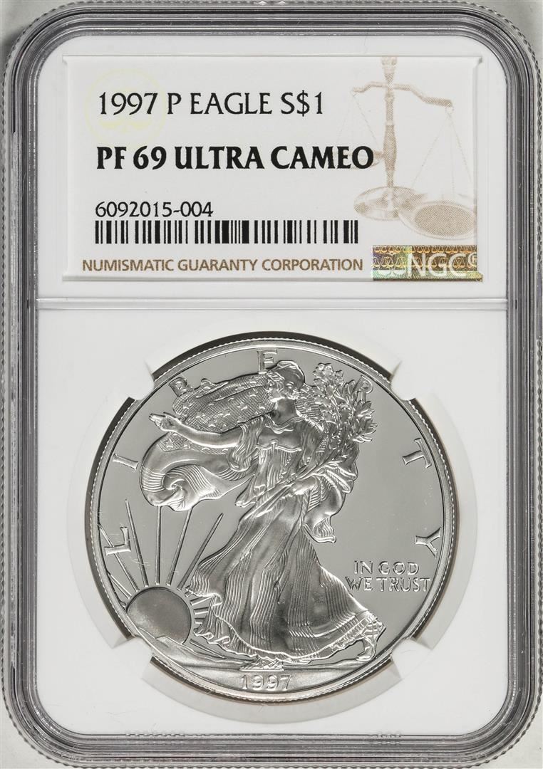 One 1997-P $1 Proof American Silver Eagle Coin NGC PF69 Ultra Cameo. NGC Certified.