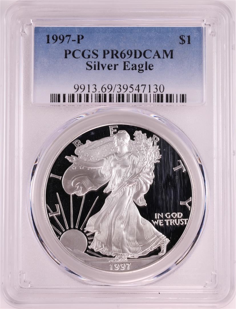 One 1997-P $1 Proof American Silver Eagle Coin PCGS PR69DCAM. PCGS Graded.