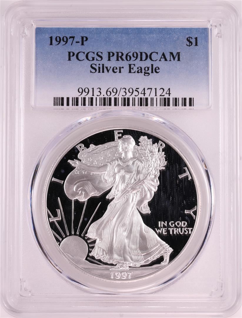 One 1997-P $1 Proof American Silver Eagle Coin PCGS PR69DCAM. PCGS Graded.