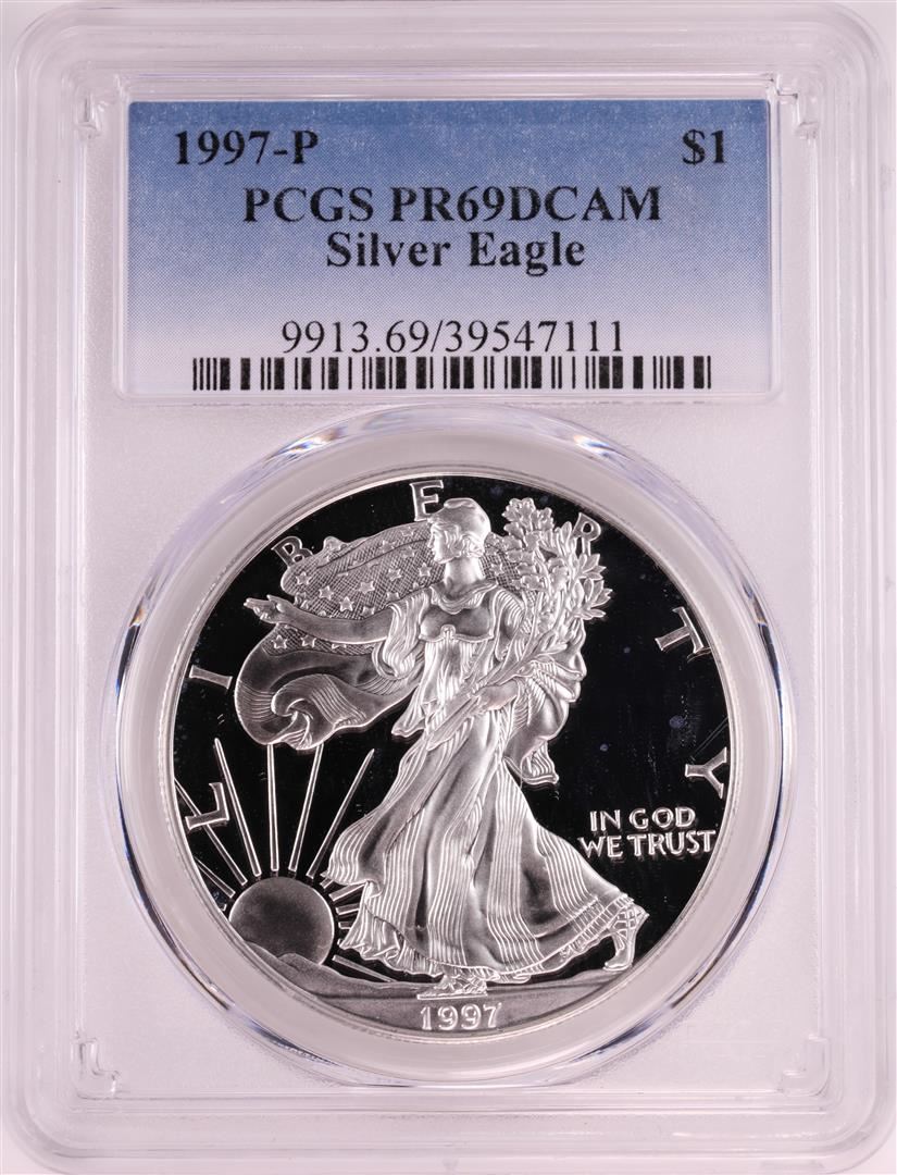 One 1997-P $1 Proof American Silver Eagle Coin PCGS PR69DCAM. PCGS Graded.