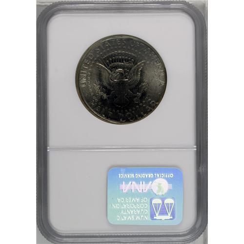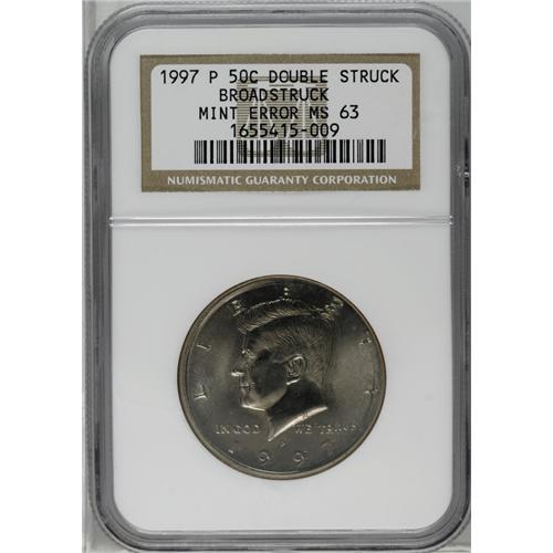 <B>1997-P<50C> Kennedy Half Dollar--Broadstruck, Double Struck--MS63 NGC.</B></I> This is a multiple-error Kennedy half dollar, broadstruck out of the collar, and double struck with slight rotation between the two impressions. Brilliant and satiny with hints of light champagne toning over light gray luster.