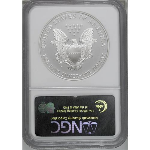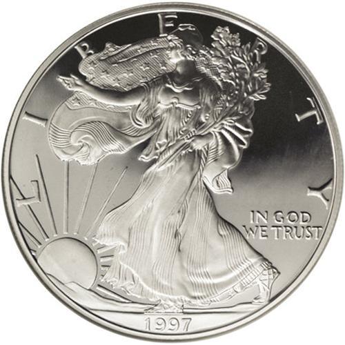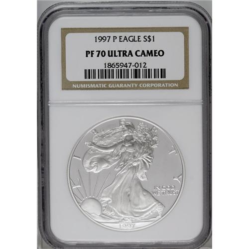 <B>1997-P<img border='0' src='http://www.heritagecoins.com/images/star.gif' width=10 height=10>$1> Silver Eagle PR70 Ultra Cameo NGC.</B></I> Outstanding contrast on this large silver eagle with booming contrast and apparent perfection. Census: 204 in 70 (3/06). <BR><BR><B>Important notice:</B> Heritage usually auctions material at the rate of 200-250 lots per hour. On some occasions eBay Live bid software or the Internet may not be able to keep up with the pace of the auction. We recommend placing a realistic absentee bid now as insurance to avoid disappointment. Occasionally the auctioneer may eliminate or reject an eBay Live bid, and the auctioneer may also reopen a lot after the close of the eBay live bidding (usually because we missed an audience bid), and may reject your bid even if it shows you as the winning bidder. By bidding via eBay Live, you agree that Heritage may award the lot to another bidder at its sole discretion under the circumstances described above or any other reasonable circumstances. Since eBay bids are not shown to us until we open the lot on the floor, we treat those bids just like floor bids. In most cases the floor responds before the eBay bid is presented to us, due to Internet lag time, so for consistency we have made it a policy that floor bids are always considered first over tie eBay live bids. Also please note that all Heritage lots purchased through eBay Live carry a 20% Buyer's Premium. Please make sure you read the Terms and Conditions before you bid. This lot is being auctioned in conjunction with a live floor auction by Heritage Galleries & Auctioneers. All final auction and invoice information will be supplied by Heritage Galleries & Auctioneers, and all other information should be considered preliminary. Lot:5211 <BR><BR><B>Winning Notification and Billing:</B> After the FINAL session in this auction is complete, Heritage will send e-mail and snail mail invoices. This process normally takes several days. All final auction and invoice information will be supplied by Heritage Galleries & Auctioneers, and all other information should be considered preliminary. <BR><BR>This auction will be conducted on a live auction floor and over the Internet through eBay Live. If you choose to place an absentee bid, please take a moment to <font color='#0000ff'><u><a href='http://pages.ebay.com/liveauctions/help/before/laabsentee.html'>learn how eBay Live absentee bidding works</a></u></font><font color='#000000'>