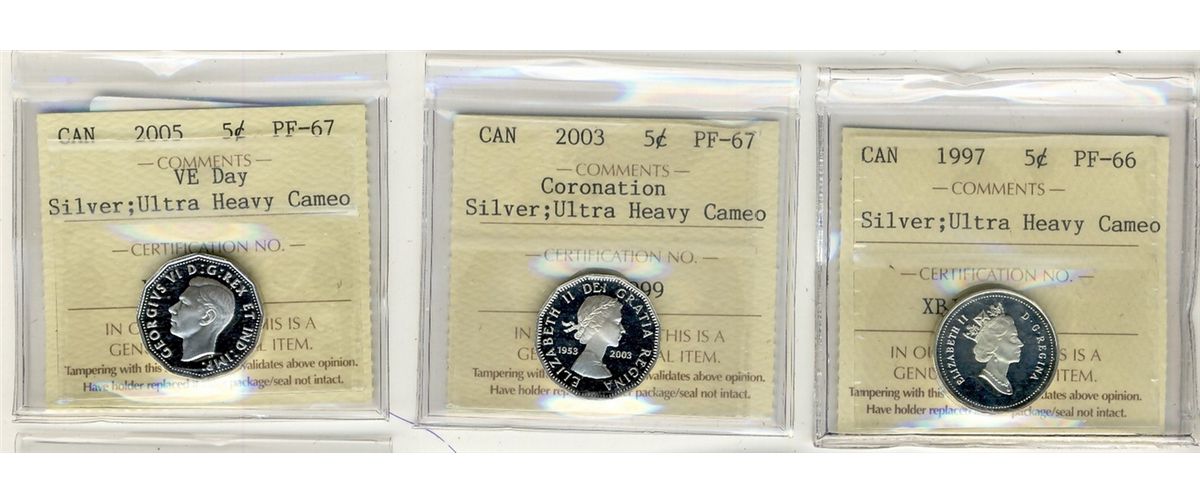 1997 PF66, 2003 Coronation, 2005 VE Day 5 Cents PF67; Three ICCS coins Ultra Heavy Cameo.