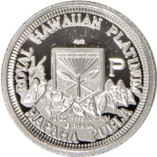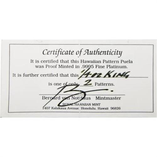 <B>1997 Proof Quarter-Ounce Platinum Pattern, 1 of 2 Struck.</B></I> Platinum, 1/4 oz .999 fine <B>proof</B></I> pattern puela issued by the Royal Hawaiian Mint. The piece comes with a certificate of authenticity signed by Bernard Van Nothaus, Mintmaster that this is one of only two pieces struck. Comes with the original box of issue.<BR><BR><b>Shipping:</b> Coins & Currency (<a target="_blank" href="http://www.heritageauctions.com/common/shipping.php">view shipping information</a>)