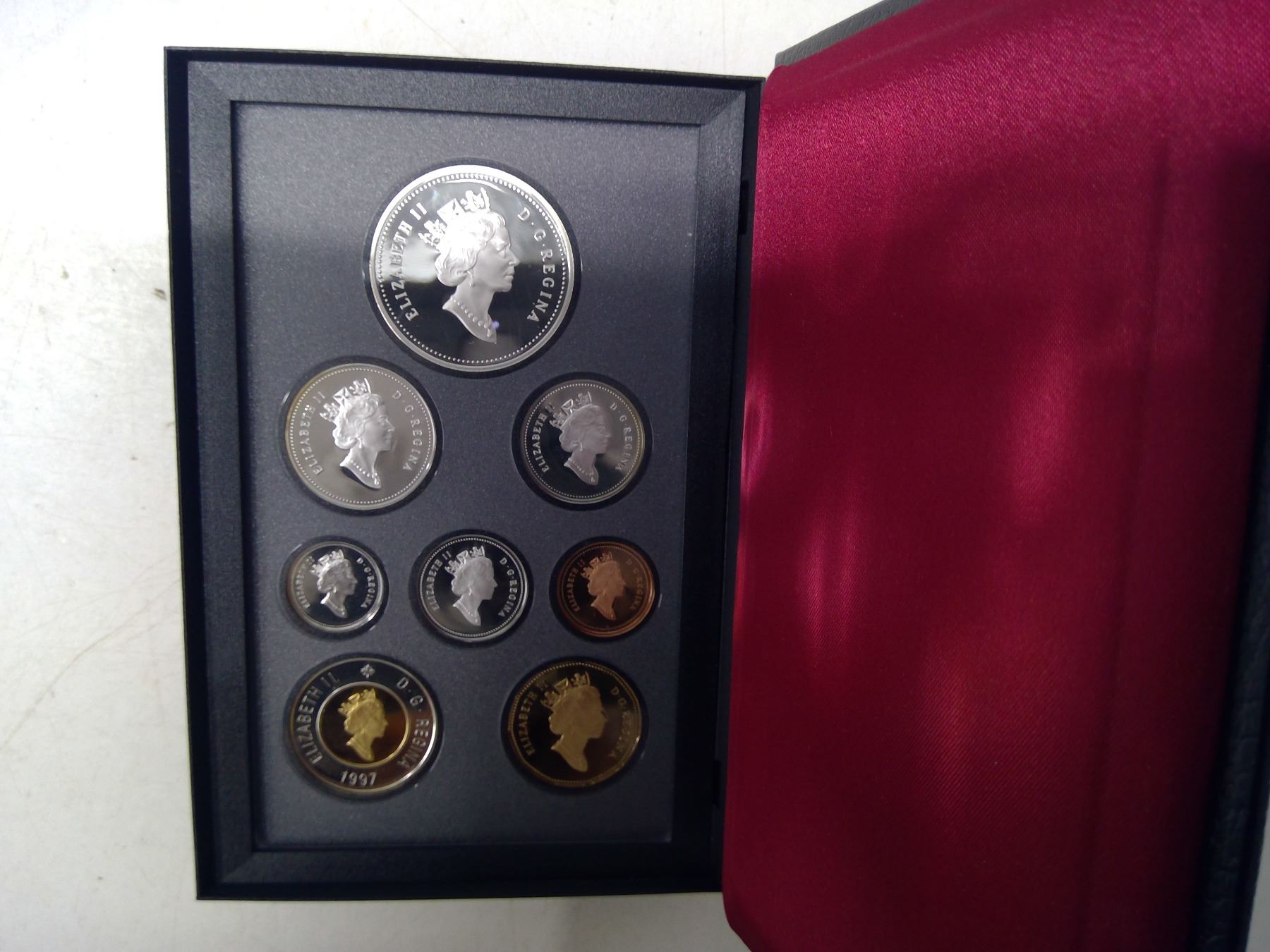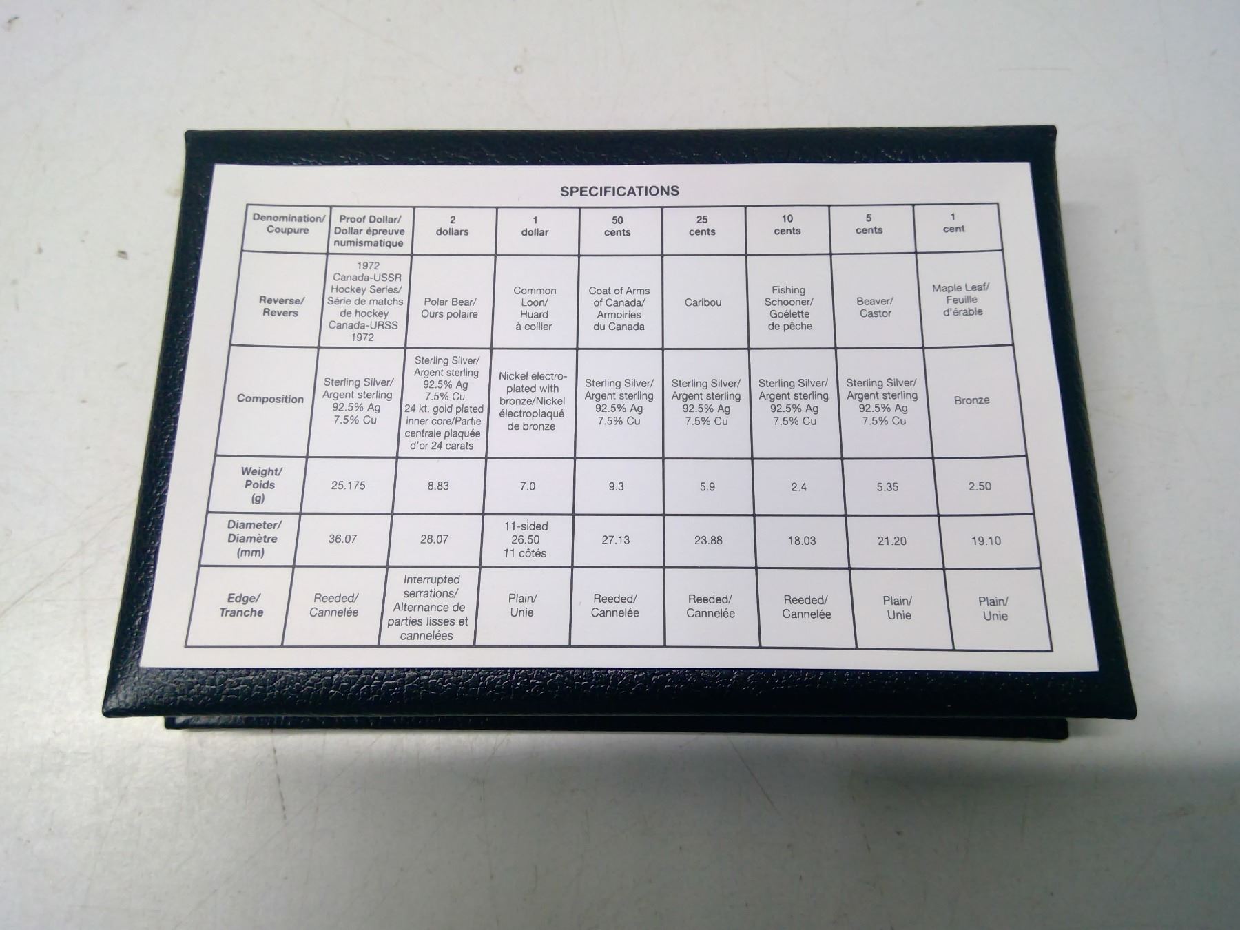 1997 Proof Set. 7-coin set includes Silver Dollar that commemorates the 50tth Anniversary of the Canada-Russia hockey series. The Silver Dollar is Sterling Silver. Proof with Ultra Heavy Cameos. Housed in its original Royal Canadian Mint case of issue. Includes Certificate of Authenticity.