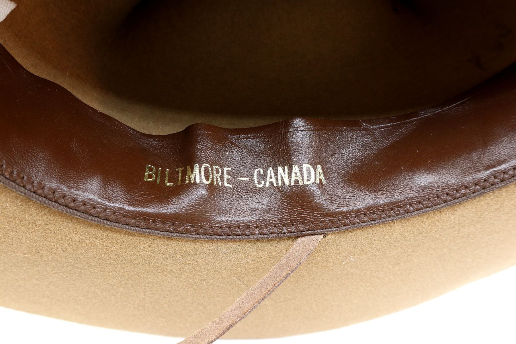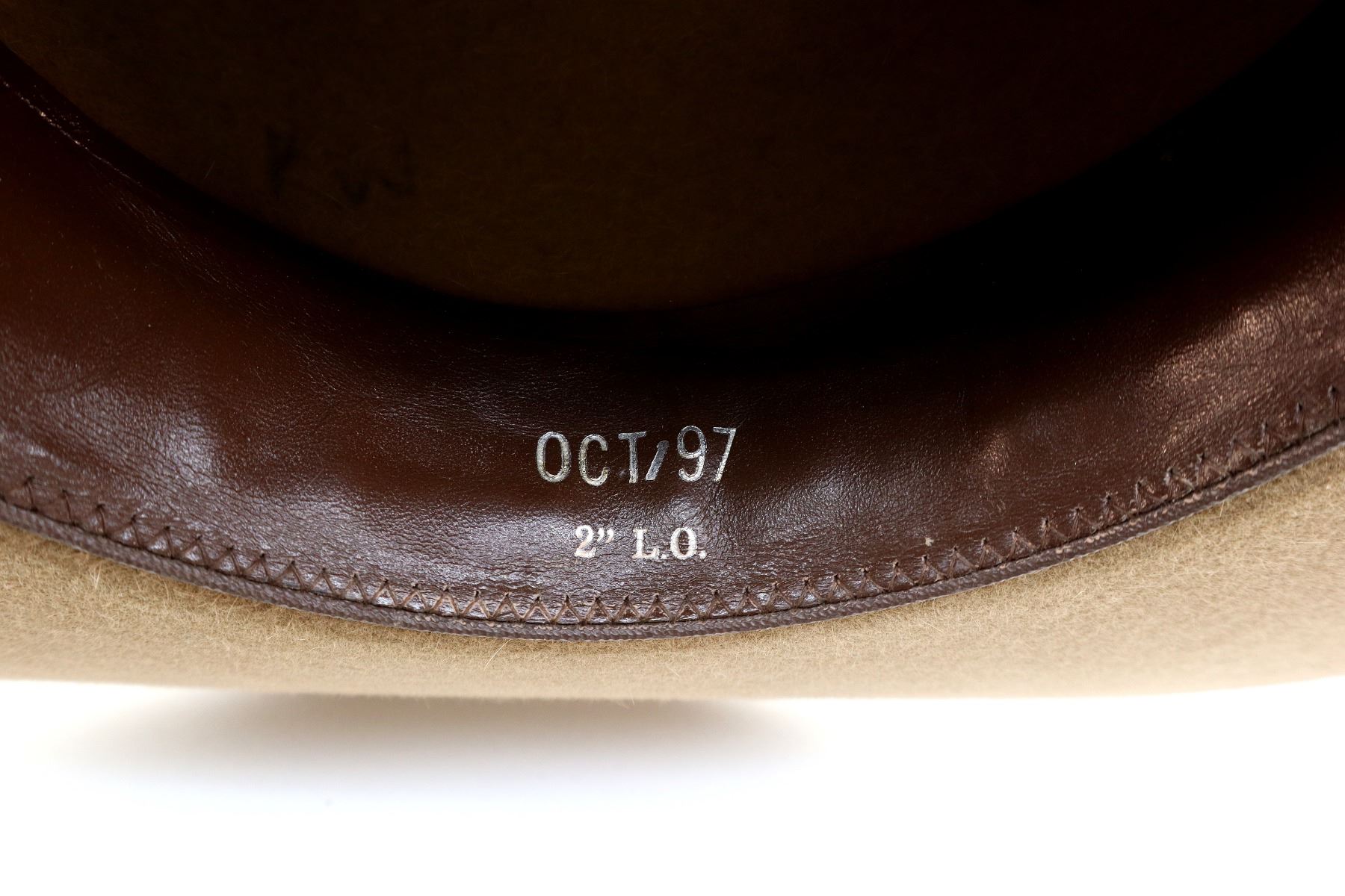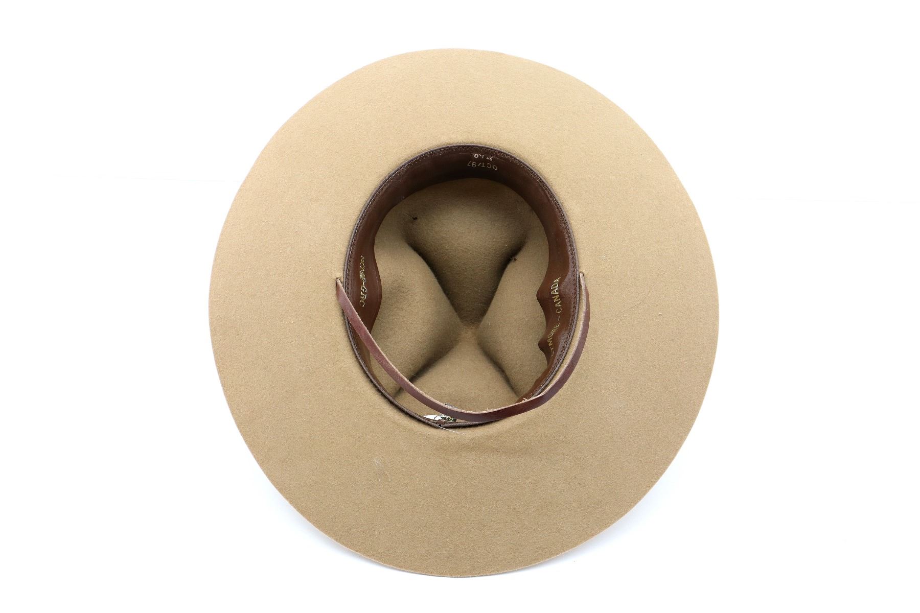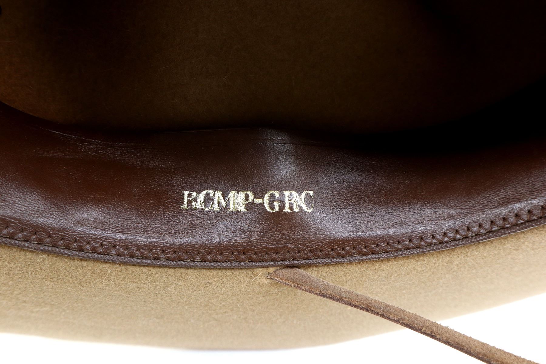 (1) BEIGE FELT WITH CIRCULAR BEAK, BROWN LEATHER BAND, INNER LEATHER HEAD BAND MARKED: "RCMP-GRC", "OCT/97, 2" L.O.", "BILTMORE-CANADA" & "55, 6 7/8", LEATHER CHIN STRAP. SEE PHOTOS.