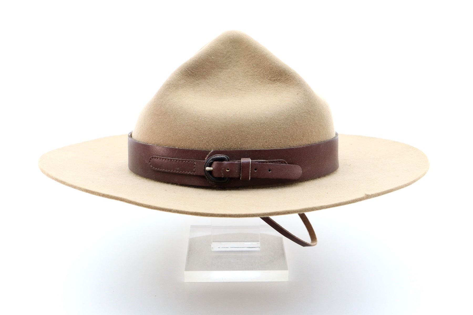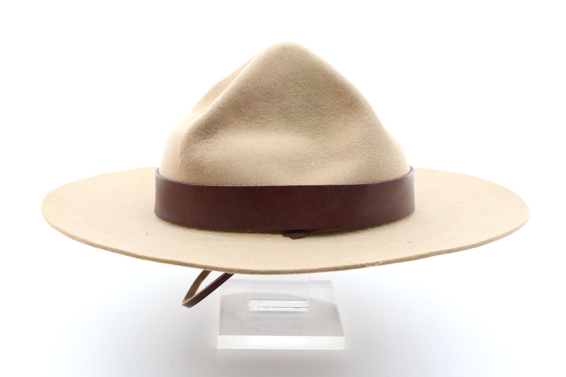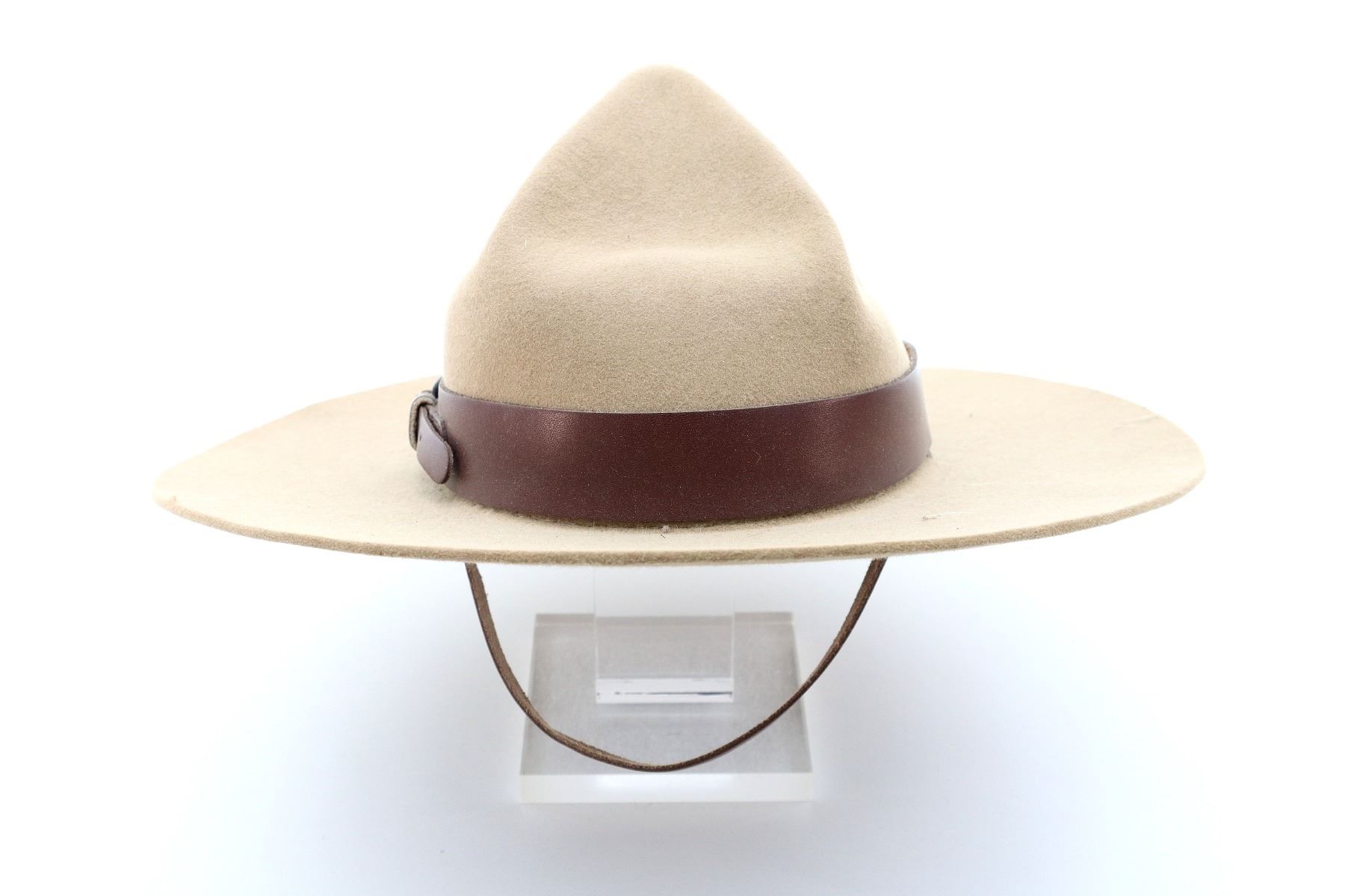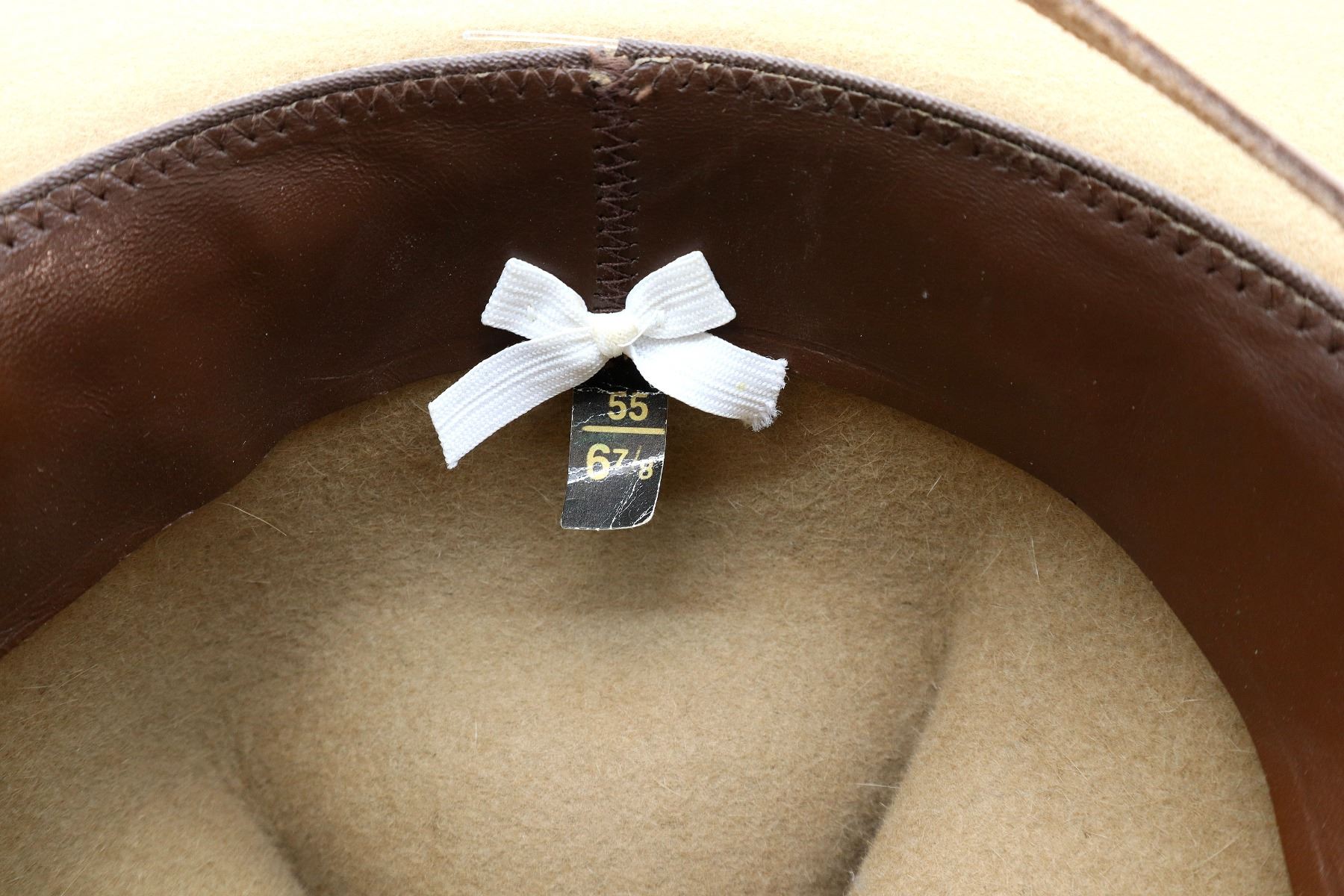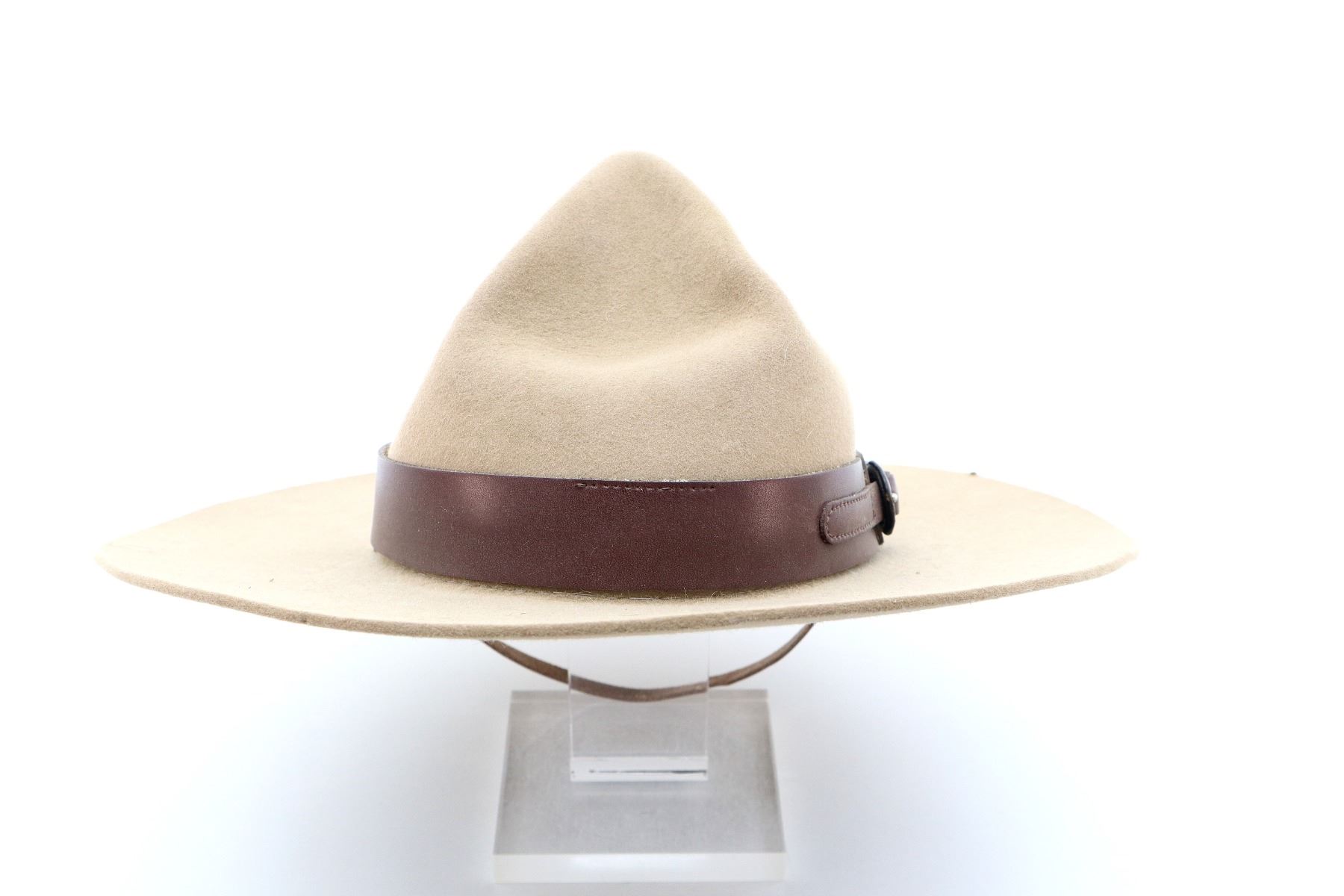 (1) BEIGE FELT WITH CIRCULAR BEAK, BROWN LEATHER BAND, INNER LEATHER HEAD BAND MARKED: "RCMP-GRC", "OCT/97, 2" L.O.", "BILTMORE-CANADA" & "55, 6 7/8", LEATHER CHIN STRAP. SEE PHOTOS.