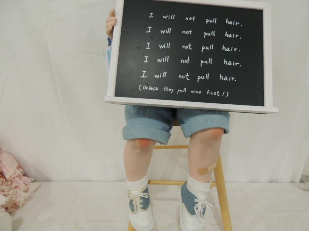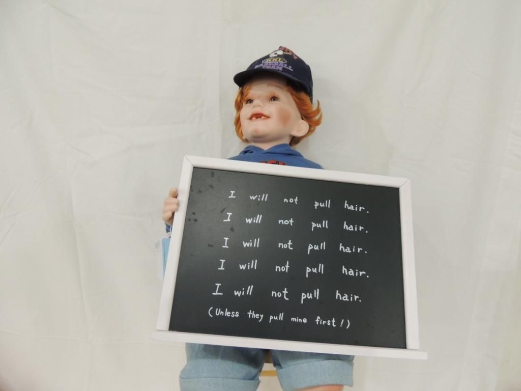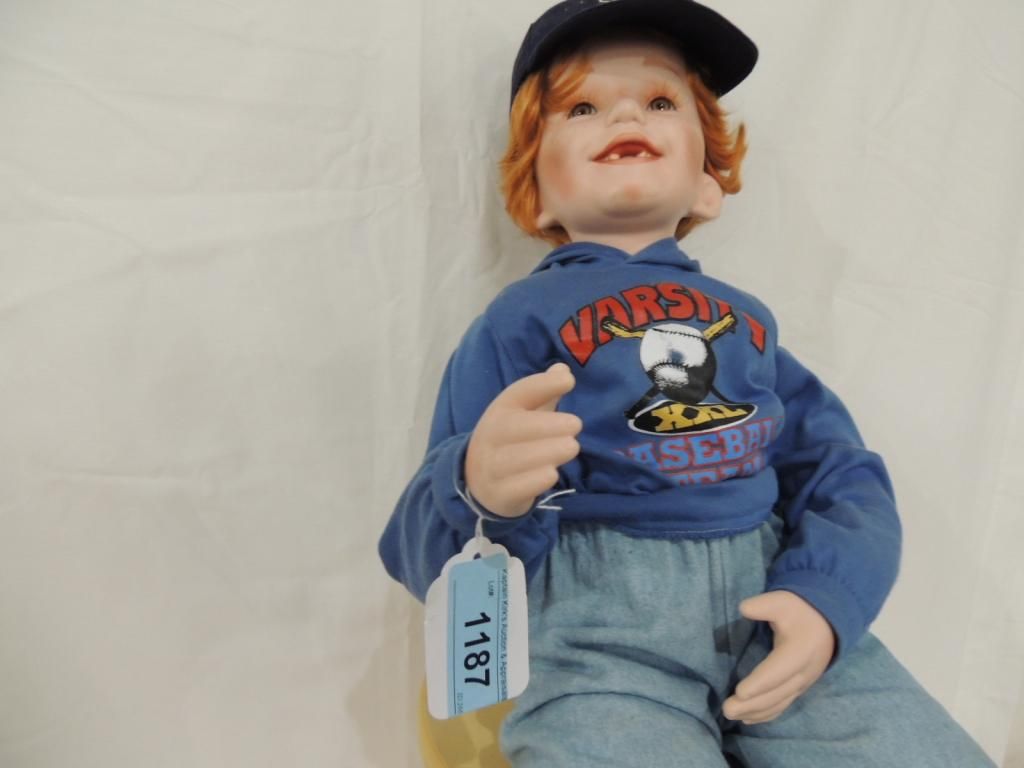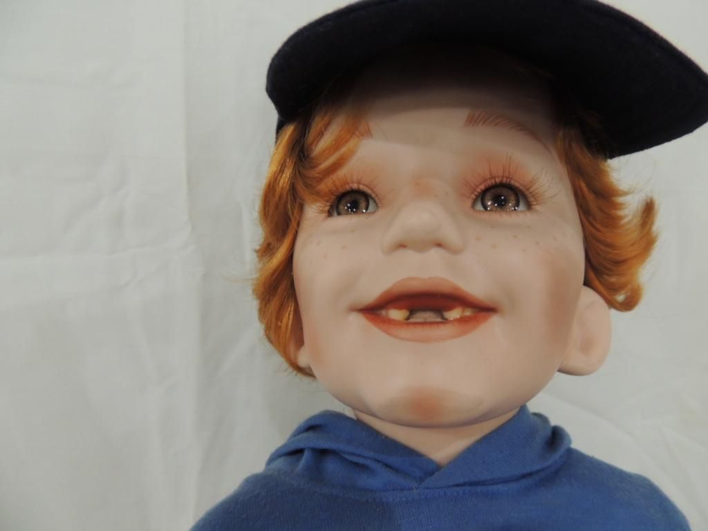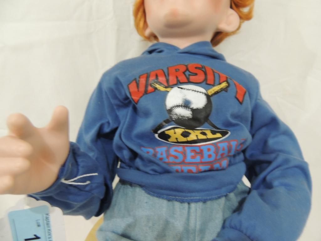 RED HAIRED PORCELAIN DOLL FRECKLES BASEBALL TEAM HAT AND SHIRT. BAND AID ON KNEE. AS SHOWN. SEE PHOTO FOR MORE DETAILS.