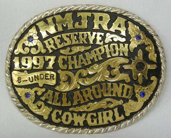1997 Red Bluff Cowgirl Rodeo Buckle, from New Mexico. ''Reserve Champion 8-Under All Around Cowgirl''. Measures approx. 4 1/2'' x 3 1/2''. SHI $15.