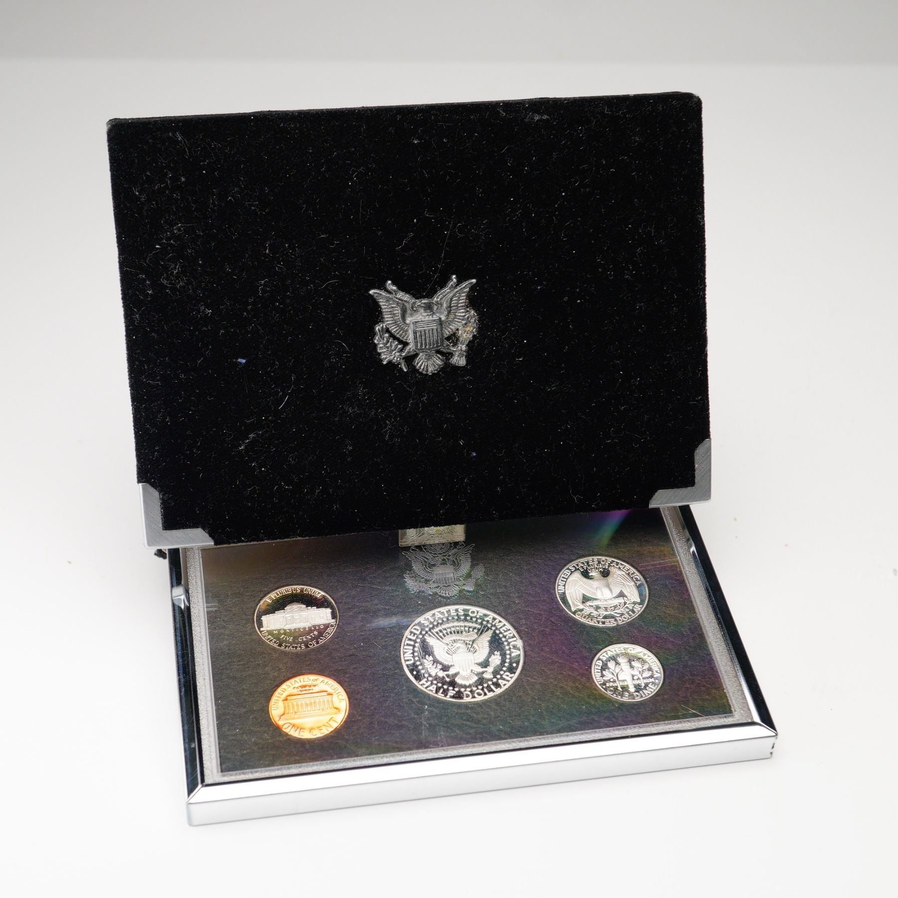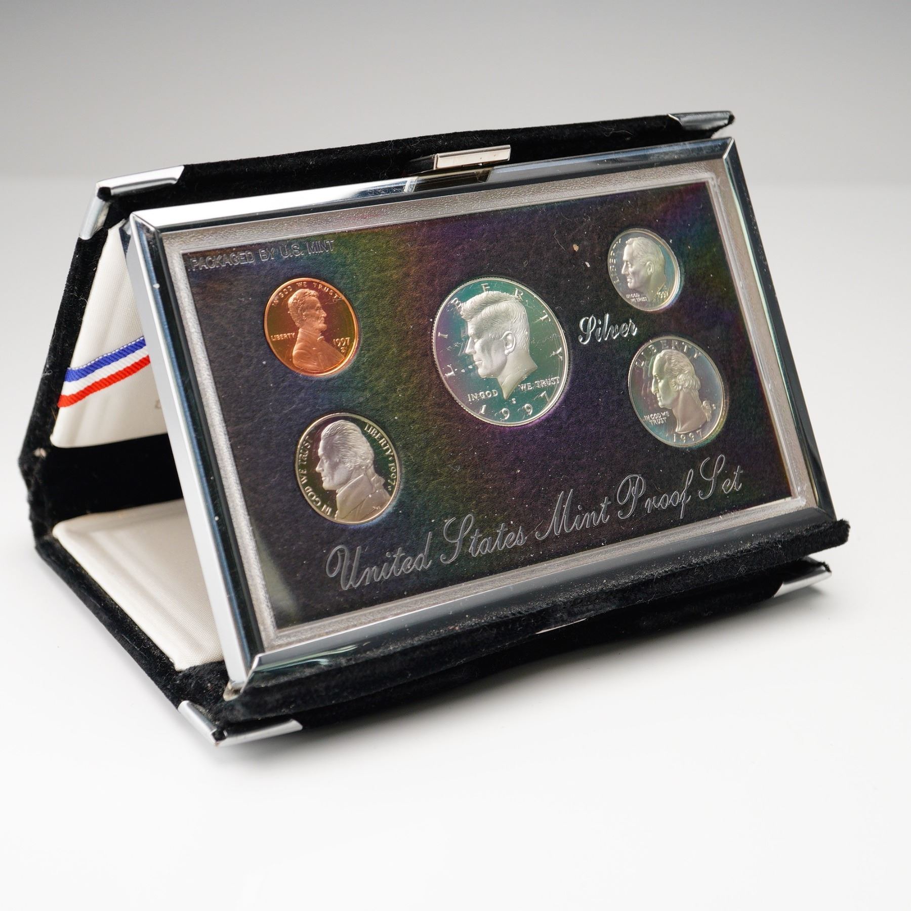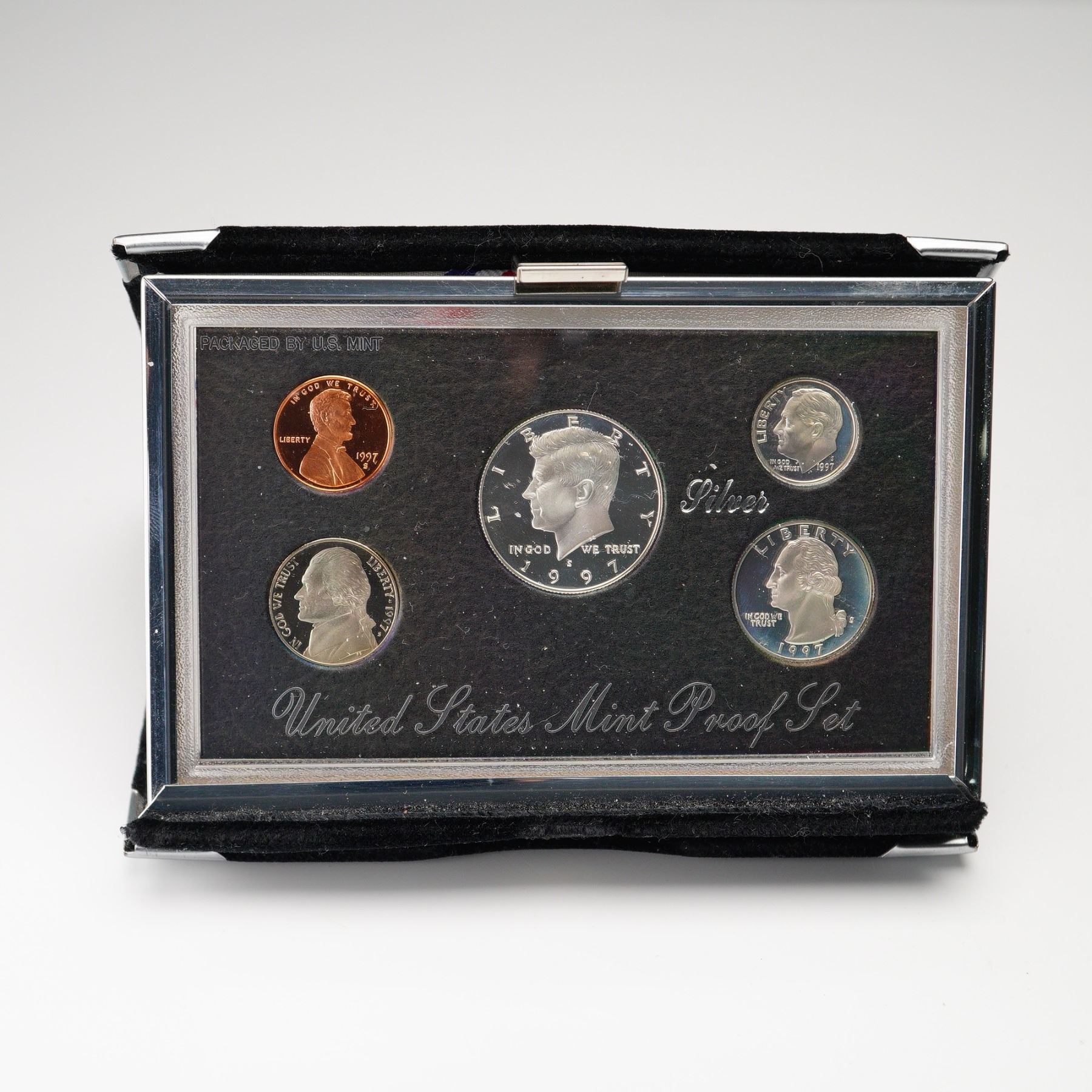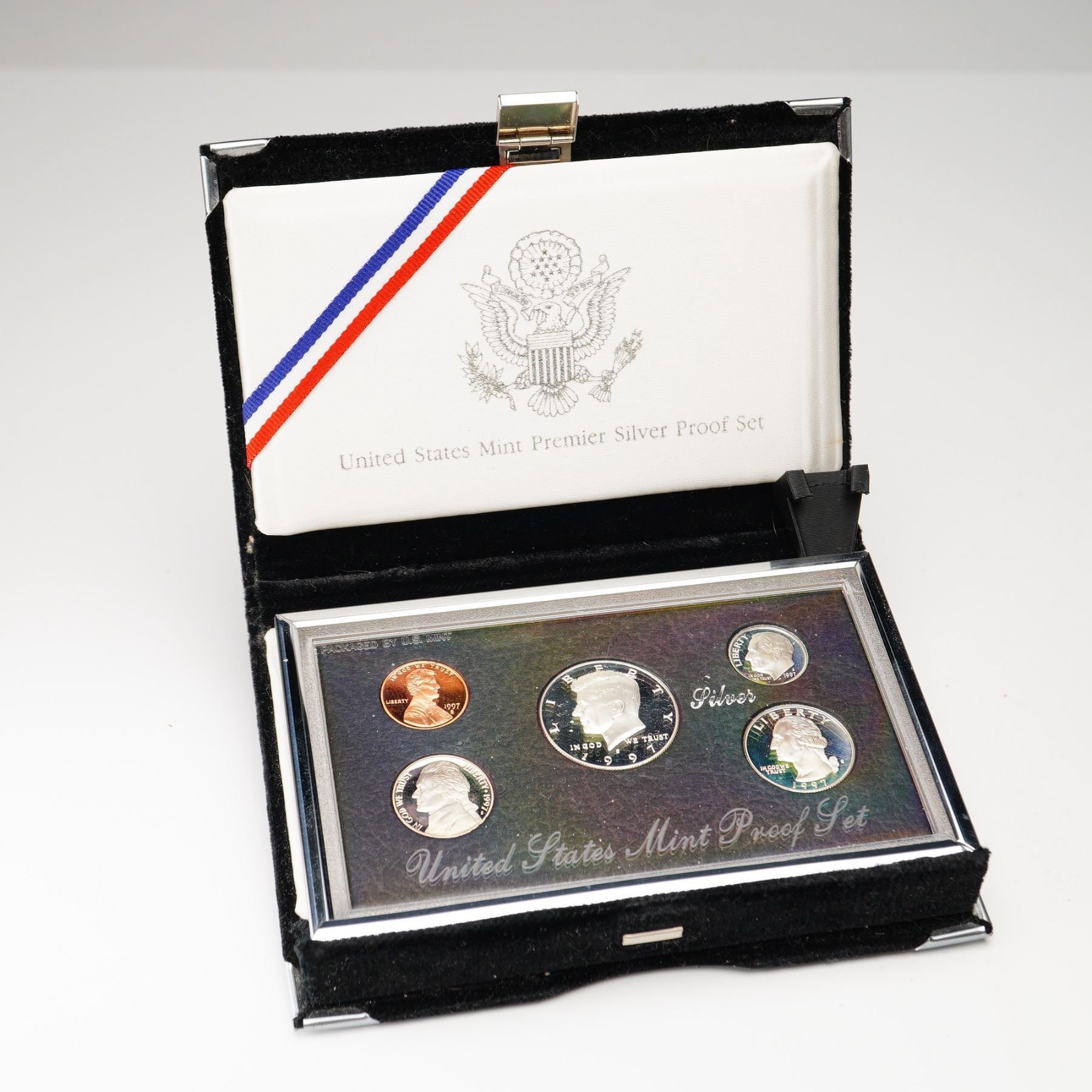 A complete 1997 United States Mint Premier Silver Proof Set featuring five coins struck in deep cameo proof quality; a Lincoln cent, Jefferson nickel, Roosevelt dime, Washington quarter, and Kennedy half dollar. The dime, quarter, and half dollar are composed of 90% silver. Each coin exhibits frosted devices and mirrored fields, showcasing the precision of the San Francisco Mint as inscribed to the obverse of each coin. The reverse of each coin showcases various important monuments and seals. Presented in its original deluxe black velvet display case with a satin-lined lid bearing the U.S. Great Seal.