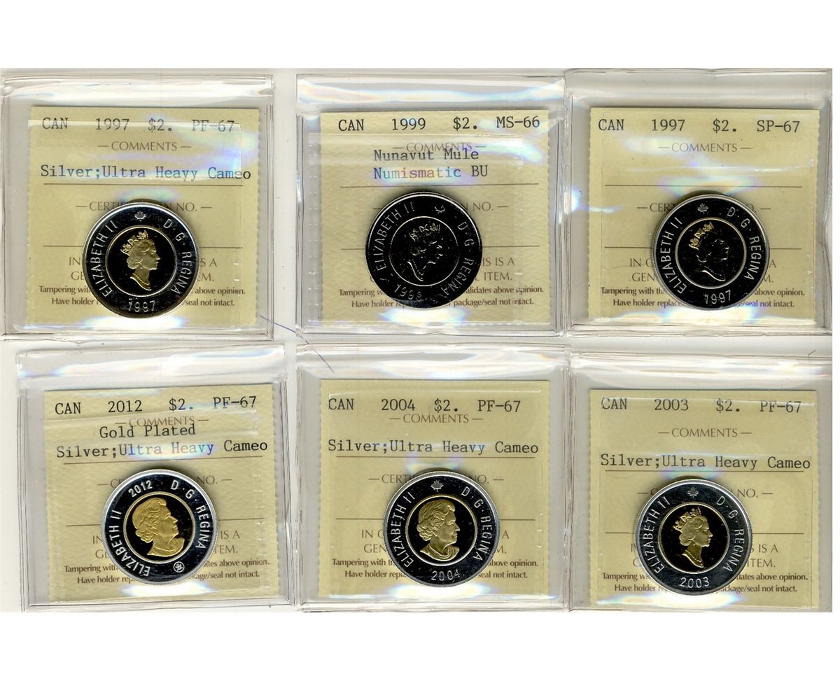 1997 SP67, 1999 $2 MS66 NBU, 1997, 2003, 2004, 2012 Silver PF67UHC; Six ICCS coins.