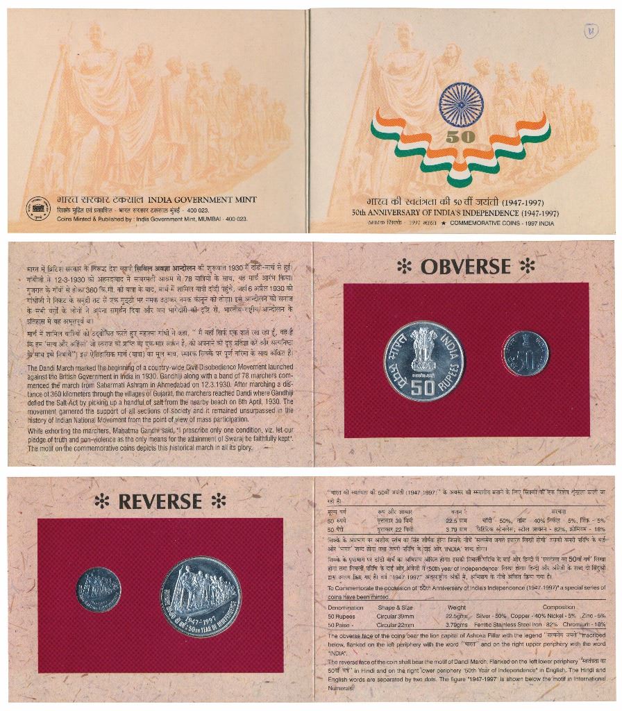 1997 Uncirculated Set, 50th Anniversary of India’s Independence, set of 2, 50 Paisa and Rupees 50. In immaculate condition, within original packaging. (2)