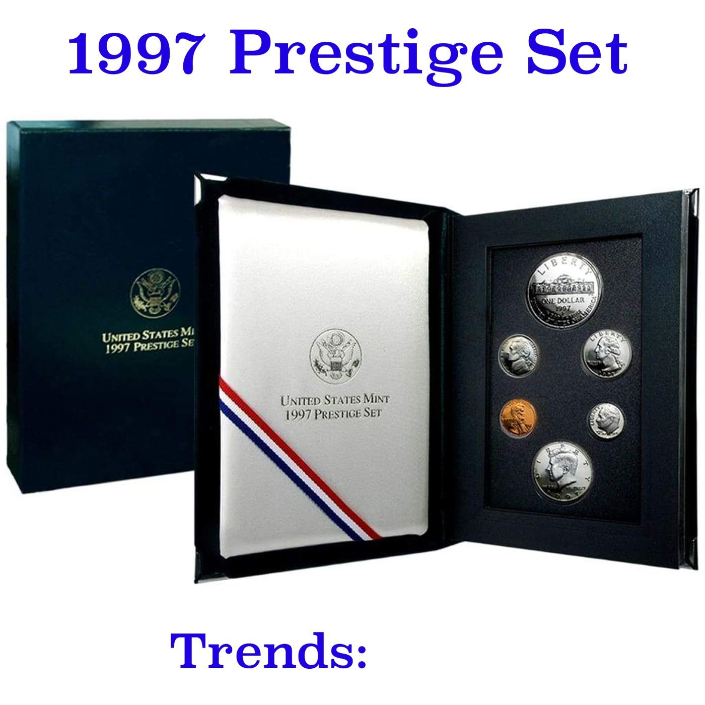 1997 United States Mint Prestige Proof Set. Contains the 1997 Prestige Proof Set 90% silver 1997 Botanic Garden Commemorative $1 plus the Traditional 5 pieces 1997 Proof Set. Includes all the original packaging and the COA. Note* The silver Dollar alone has .7736 Oz. of pure silver.