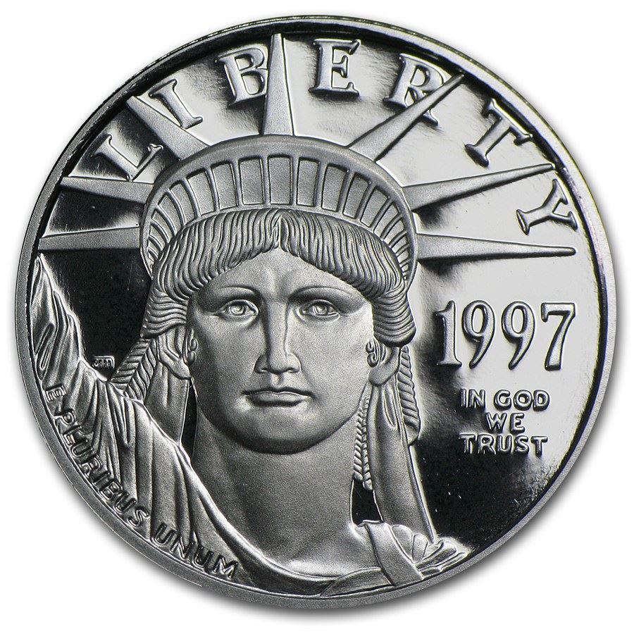 Product ID: 9585 Year: 1997 Grade: Proof Grade Service: None Denomination: $25 Mint Mark: W - West Point Metal Content: 0.25 troy oz Purity: .9995 Manufacturer: U.S. Mint Thickness: 1.32 mm Diameter: 22 mm