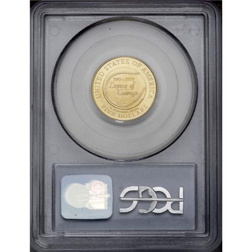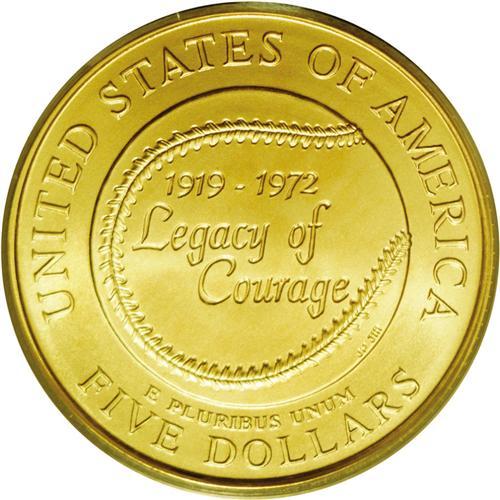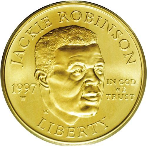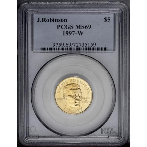 <B>1997-W<G$5> Jackie Robinson Gold Five Dollar MS69 PCGS.</B></I> A beautifully preserved example, with pristine matte-like surfaces and a full strike. <BR><BR><B>Important notice:</B> Heritage usually auctions material at the rate of 200-250 lots per hour. On some occasions eBay Live bid software or the Internet may not be able to keep up with the pace of the auction. We recommend placing a realistic absentee bid now as insurance to avoid disappointment. Occasionally the auctioneer may eliminate or reject an eBay Live bid, and the auctioneer may also reopen a lot after the close of the eBay live bidding (usually because we missed an audience bid), and may reject your bid even if it shows you as the winning bidder. By bidding via eBay Live, you agree that Heritage may award the lot to another bidder at its sole discretion under the circumstances described above or any other reasonable circumstances. Since eBay bids are not shown to us until we open the lot on the floor, we treat those bids just like floor bids. In most cases the floor responds before the eBay bid is presented to us, due to Internet lag time, so for consistency we have made it a policy that floor bids are always considered first over tie eBay live bids. Also please note that all Heritage lots purchased through eBay Live carry a 20% Buyer's Premium. Please make sure you read the Terms and Conditions before you bid. This lot is being auctioned in conjunction with a live floor auction by Heritage Galleries & Auctioneers. All final auction and invoice information will be supplied by Heritage Galleries & Auctioneers, and all other information should be considered preliminary. Lot:5199 <BR><BR><B>Winning Notification and Billing:</B> After the FINAL session in this auction is complete, Heritage will send e-mail and snail mail invoices. This process normally takes several days. All final auction and invoice information will be supplied by Heritage Galleries & Auctioneers, and all other information should be considered preliminary. <BR><BR>This auction will be conducted on a live auction floor and over the Internet through eBay Live. If you choose to place an absentee bid, please take a moment to <font color='#0000ff'><u><a href='http://pages.ebay.com/liveauctions/help/before/laabsentee.html'>learn how eBay Live absentee bidding works</a></u></font><font color='#000000'>