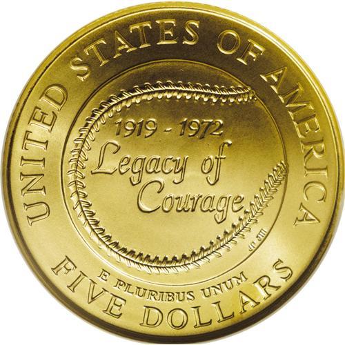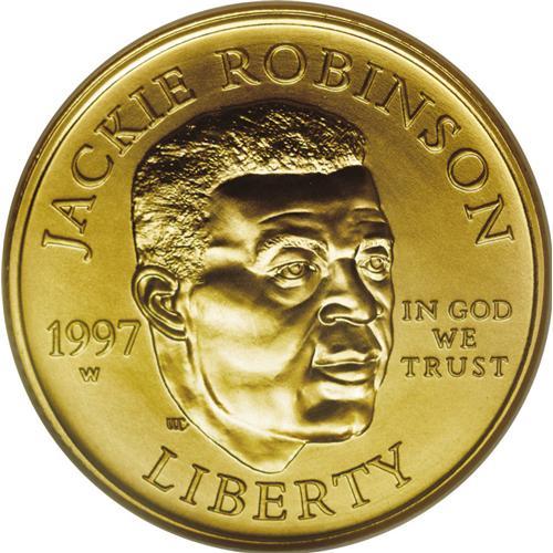 <B>1997-W<G$5> Jackie Robinson Gold Five Dollar MS70 NGC.</B></I> In 1947, Branch Rickey hired Jackie Robinson to play for the Brooklyn Dodgers, making him the first black player in major league baseball. Robinson endured many years of scorn and verbal abuse from fans but always held his temper and was a gentleman both on and off the field. He died far too early in the early 1970s. This coin commemorates the life and achievements of Jackie Robinson, one of the finest ball players to ever play for the Dodgers. The surfaces are perfect with lovely, satin-like luster and no toning what-so-ever. Census: 63 in 70 (4/06).