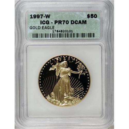 <B>1997-W G$50 One-Ounce Gold Eagle PR70 Deep Cameo ICG.</B></I> NGC Census: (291/0). PCGS Population (39/0). Numismedia Wsl. Price for NGC/PCGS coin in PR70: $1,800. (#9928)<BR><BR><b>Shipping:</b> Coins & Currency (<a target="_blank" href="http://www.heritageauctions.com/common/shipping.php">view shipping information</a>)