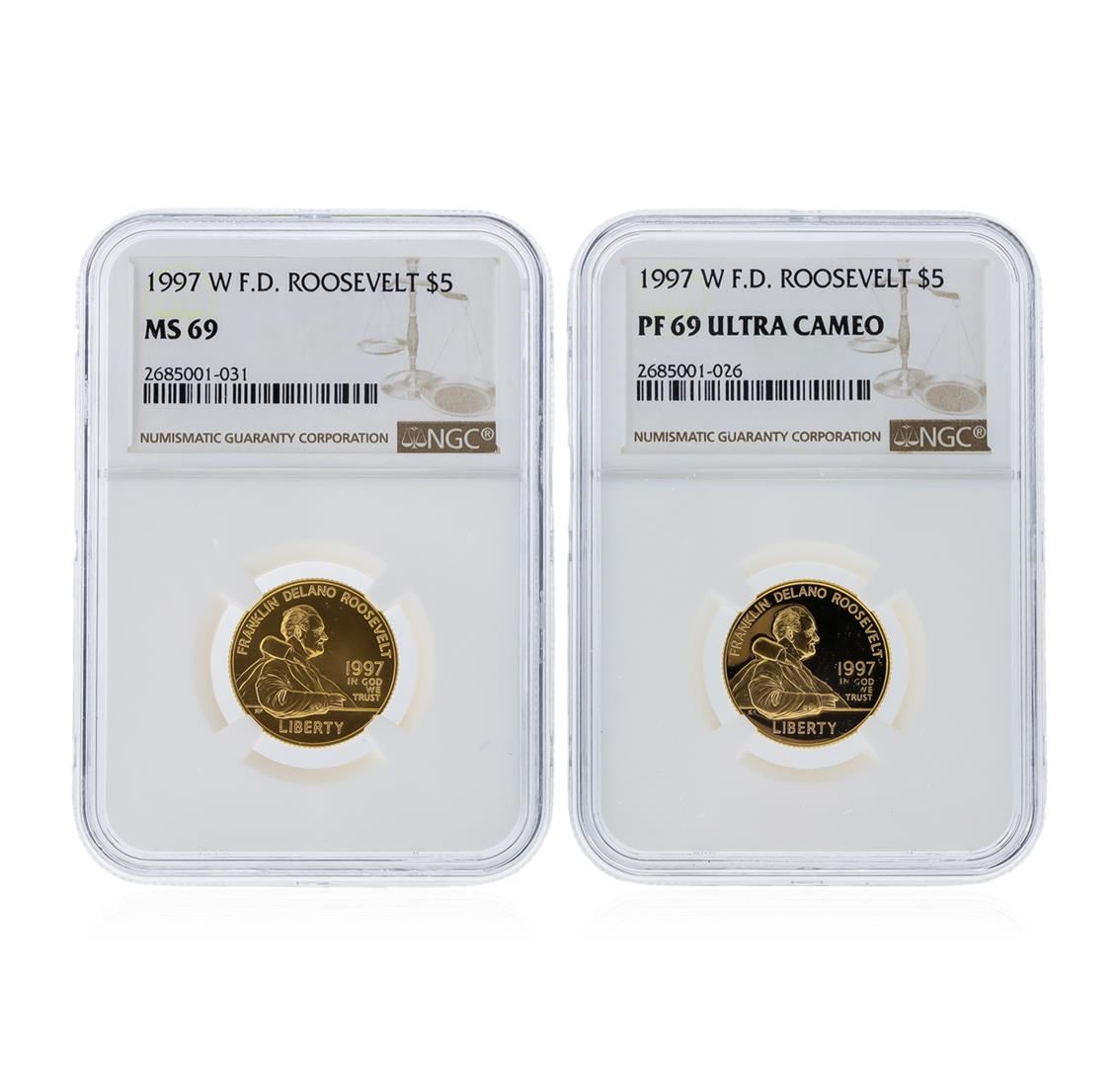 One 1997-W NGC $5 F.D. Roosevelt Coin Set. The set features a 1997-W NGC MS69 $5 F.D. Roosevelt Coin and 1997-W NGC PF69 Ultra Cameo $5 F.D. Roosevelt Coin. NGC Certified.