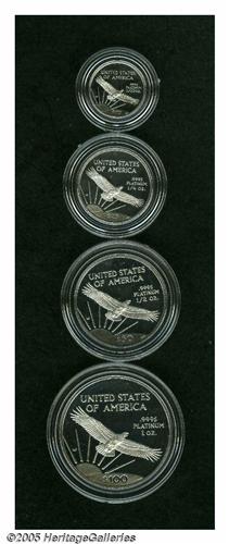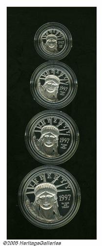 <B>1997-W<P$10> Platinum Eagle Set PR68 Deep Cameo Uncertified.</B></I> From the first year of the series, and the only year that the reverse design was the same for both business strikes and proofs. The set includes: <B>Tenth-Ounce $10; Quarter-Ounce $25, Half-Ounce $50;</B></I> and a <B>One-Ounce $100.</B></I> The presentation box and certificate of authenticity accompanies.