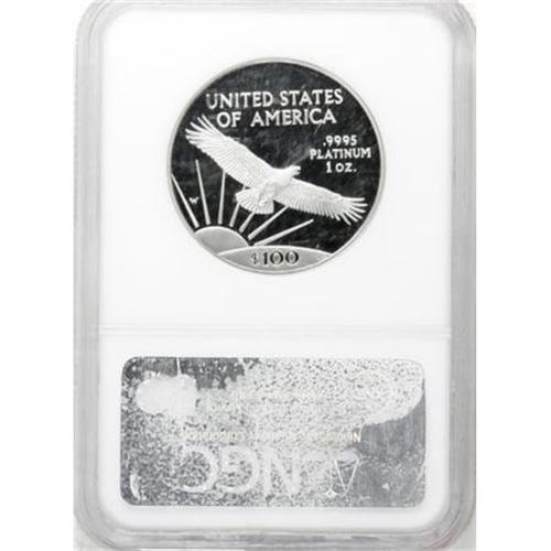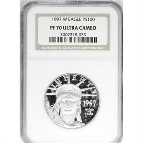 <B>1997-W P$100 One-Ounce Platinum Eagle PR70 Ultra Cameo NGC.</B></I> The platinum American Eagles in the one-ounce size deserve wider recognition, with their bold design by John Mercanti, and since the Mint began producing different reverse designs for the W-mintmarked proof coins beginning in 1998, the series has become more interesting. This piece offers, as expected, the desired silver-black contrast, with stunning eye appeal.<BR><BR><b>Shipping:</b> Coins & Currency (<a target="_blank" href="http://www.heritageauctions.com/common/shipping.php">view shipping information</a>)