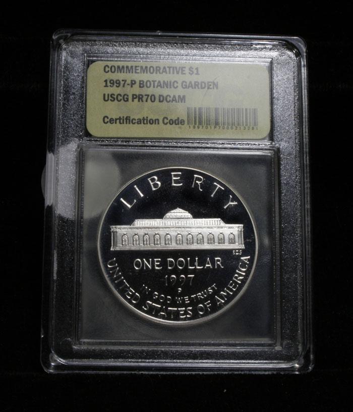 The 1997 Botanic Gardens Silver Dollar was issued for the National Botanic Garden in Washington, DC. Based on the inscriptions the occasion was for the 165th anniversary, which took place two years prior in 1995. Encapsulated and graded PR70 DCAM by USCG PCGS lists PR70 as $1750. Estimated Value $300