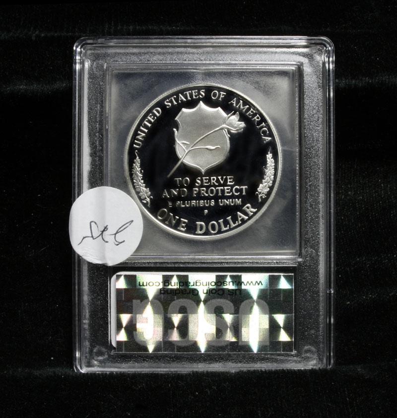 The 1997 National Law Enforcement Officers Memorial Silver Dollar was issued on the sixth anniversary of the dedication of the memorial, which honors more than 14,000 men and women who lost their lives in the line of duty. Encapsulated and graded PR70 DCAM by USCG PCGS lists PR70 as $1050. Estimated Value $300