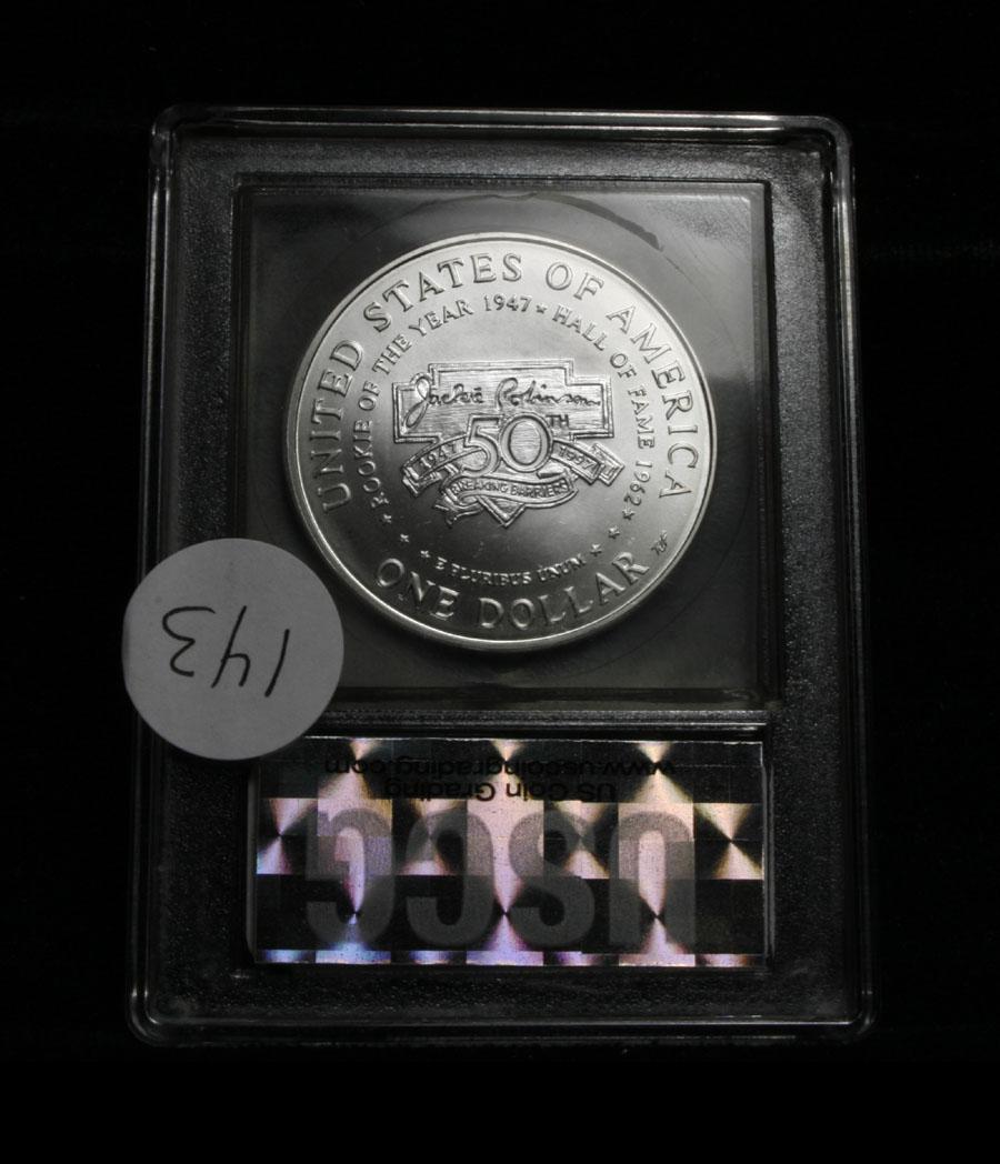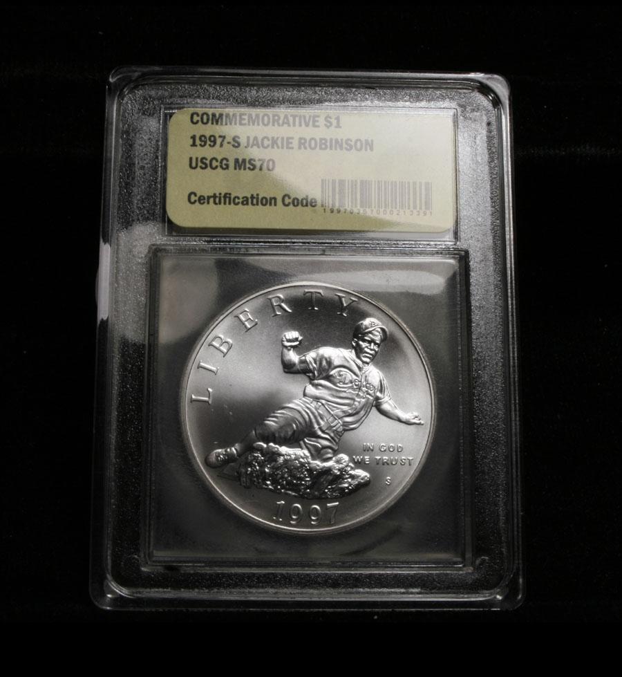 The 1997 Jackie Robinson Silver Dollar was issued in commemoration of the 50th anniversary of his appearance in a major league baseball game as the first black player. Relatively lower mintages support higher secondary market premiums for the issue. Encapsulated and Graded ms70 by USCG. PCGS lists ms70 at $2500. Estimated Value $500