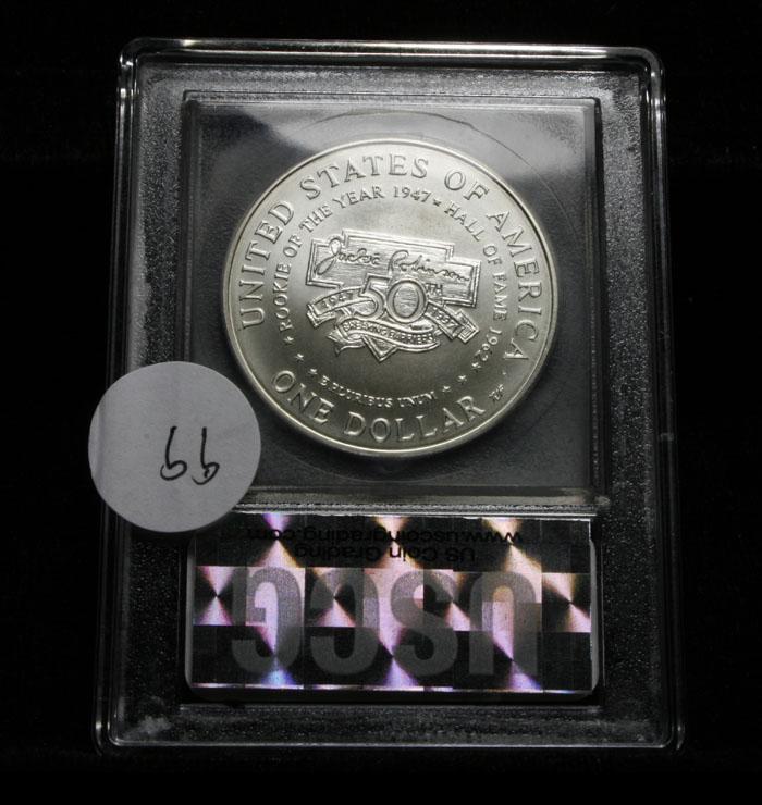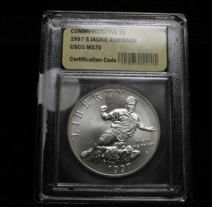 The 1997 Jackie Robinson Silver Dollar was issued in commemoration of the 50th anniversary of his appearance in a major league baseball game as the first black player. Relatively lower mintages support higher secondary market premiums for the issue. Encapsulated and Graded ms70 by USCG. PCGS lists ms70 at $2500. Estimated Value $500