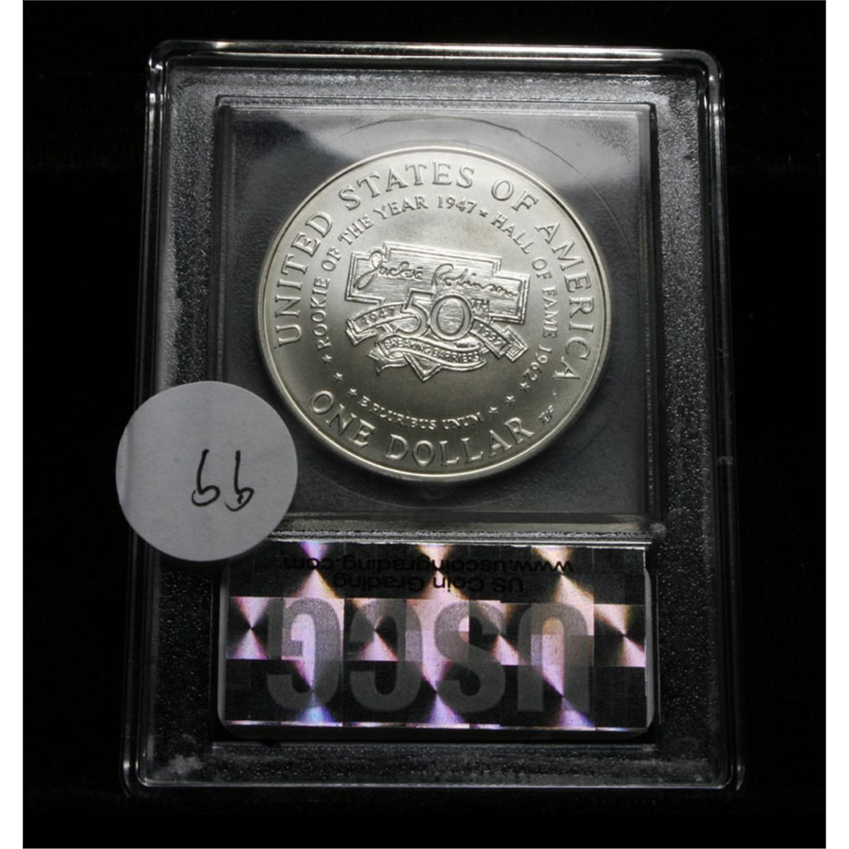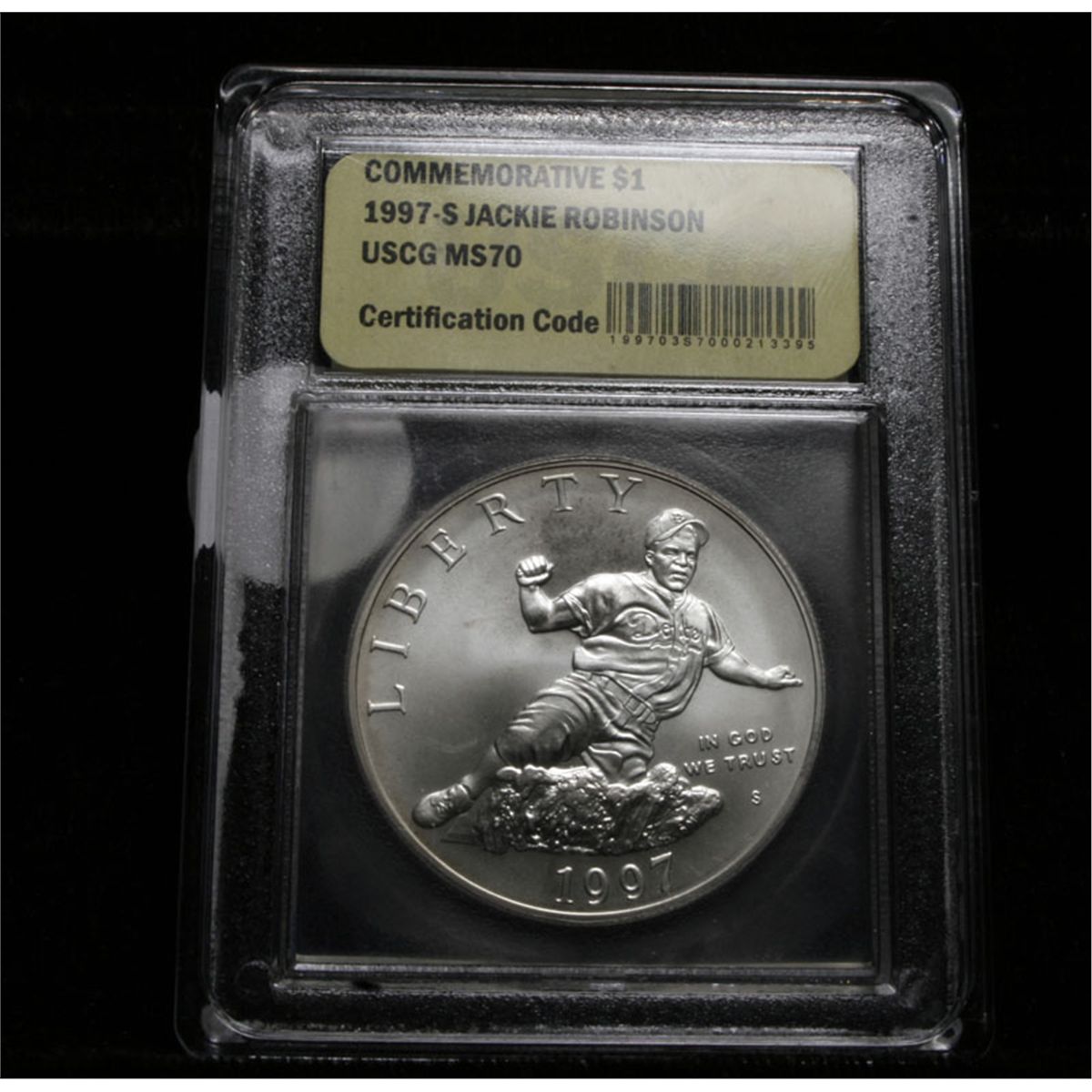 The 1997 Jackie Robinson Silver Dollar was issued in commemoration of the 50th anniversary of his appearance in a major league baseball game as the first black player. Relatively lower mintages support higher secondary market premiums for the issue. Encapsulated and Graded ms70 by USCG. PCGS lists ms70 at $2500. Estimated Value $500