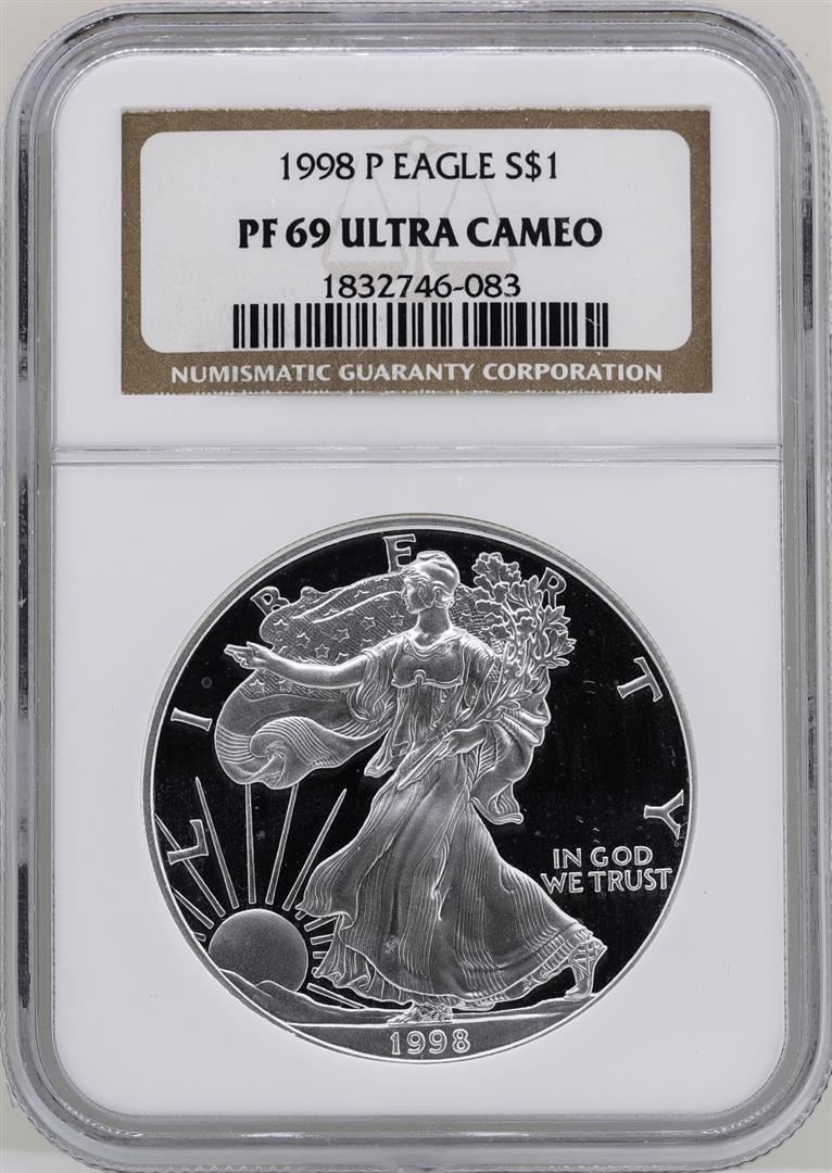 One 1998 $1 American Silver Eagle Coin NGC PF69 Ultra Cameo. NGC Certified.