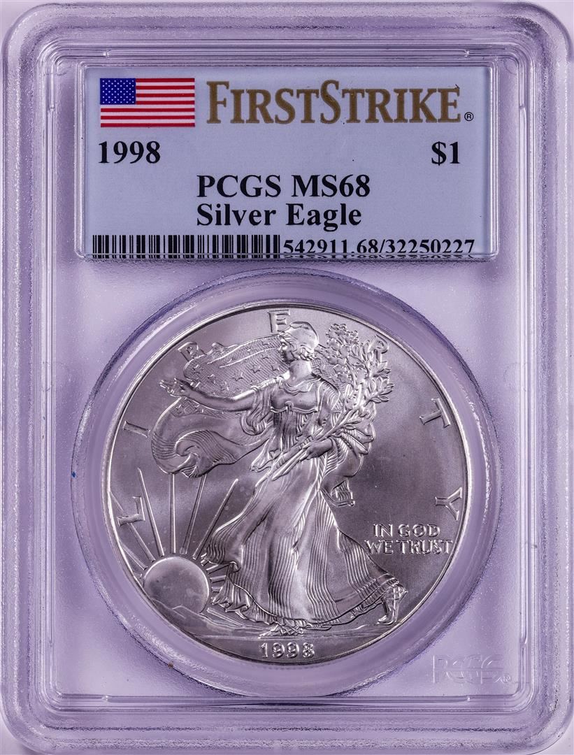 One 1998 $1 American Silver Eagle Coin PCGS MS68 First Strike. PCGS Graded.