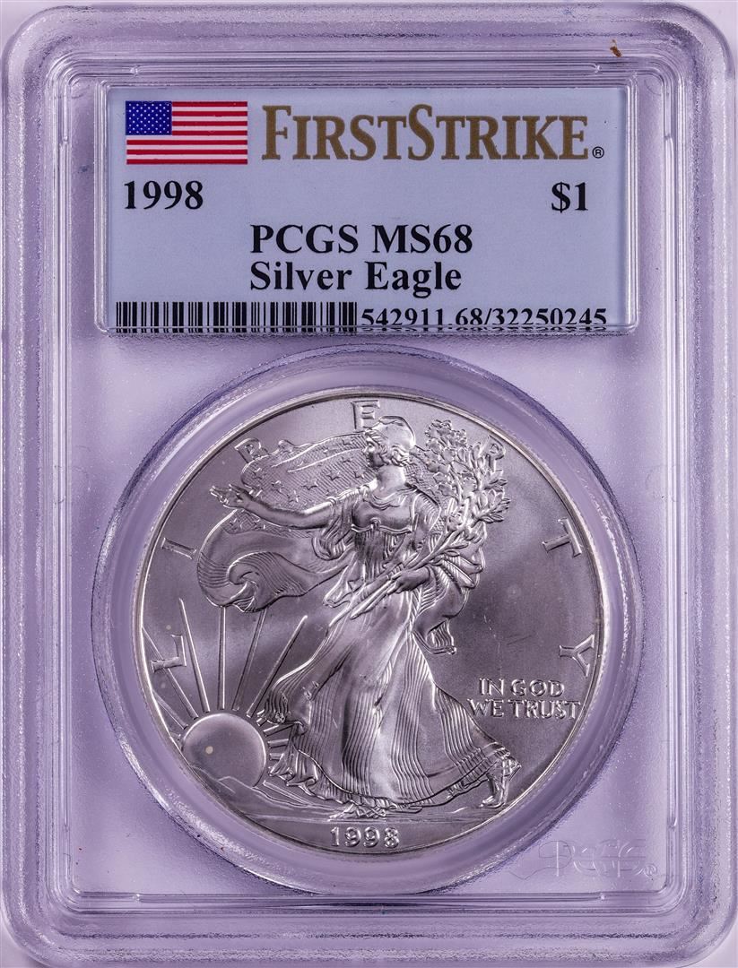 One 1998 $1 American Silver Eagle Coin PCGS MS68 First Strike. PCGS Graded.