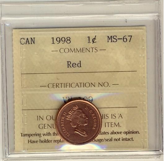 1998 1¢ ICCS MS67 Full Red, A superb GEM example.
