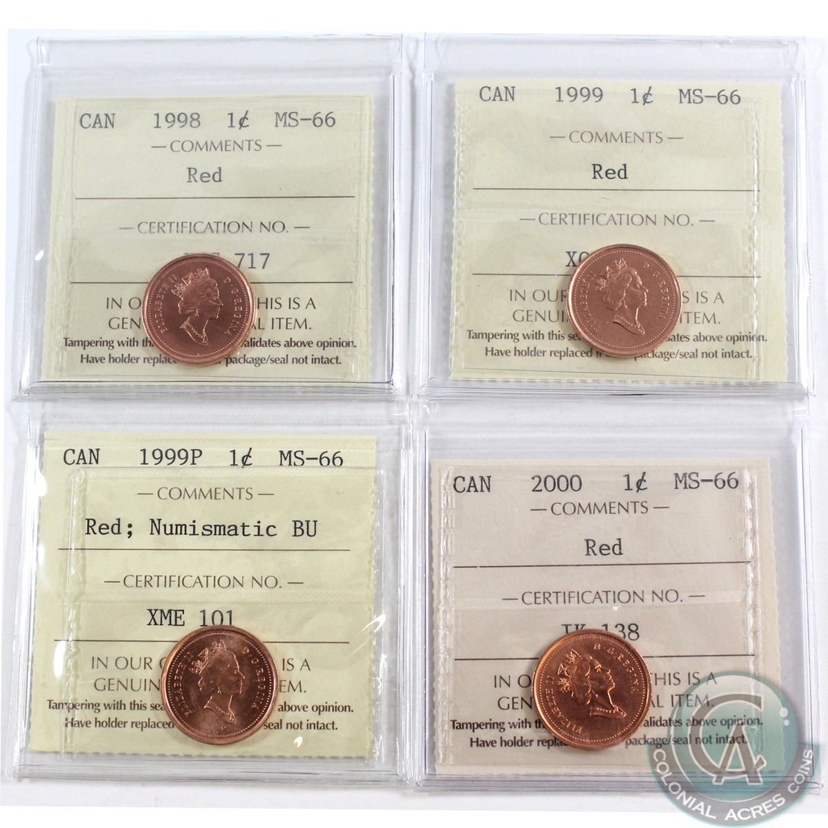 1998, 1999, 1999P NBU & 2000 Canada 1-cent ICCS Certified MS-66 Red. 4pcs