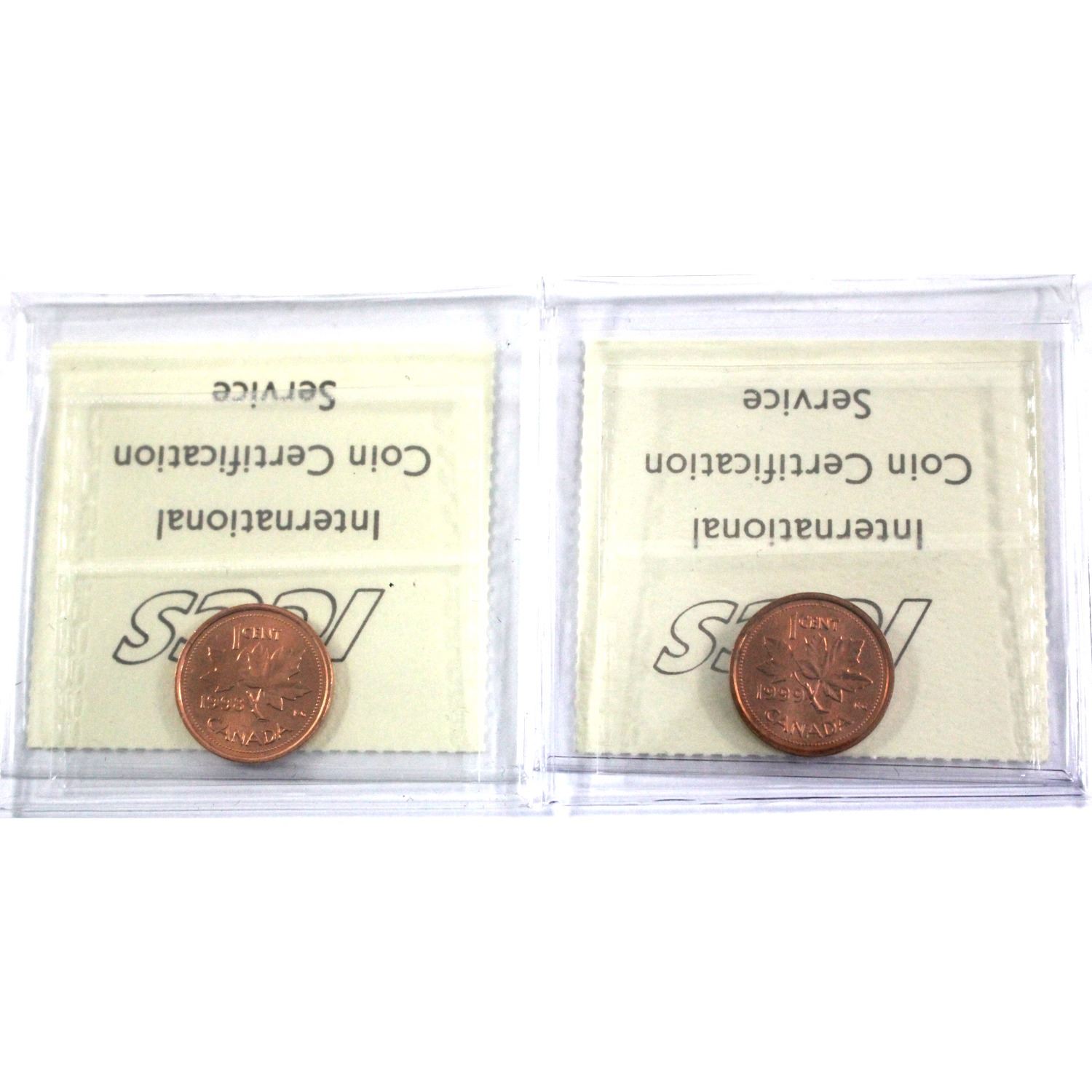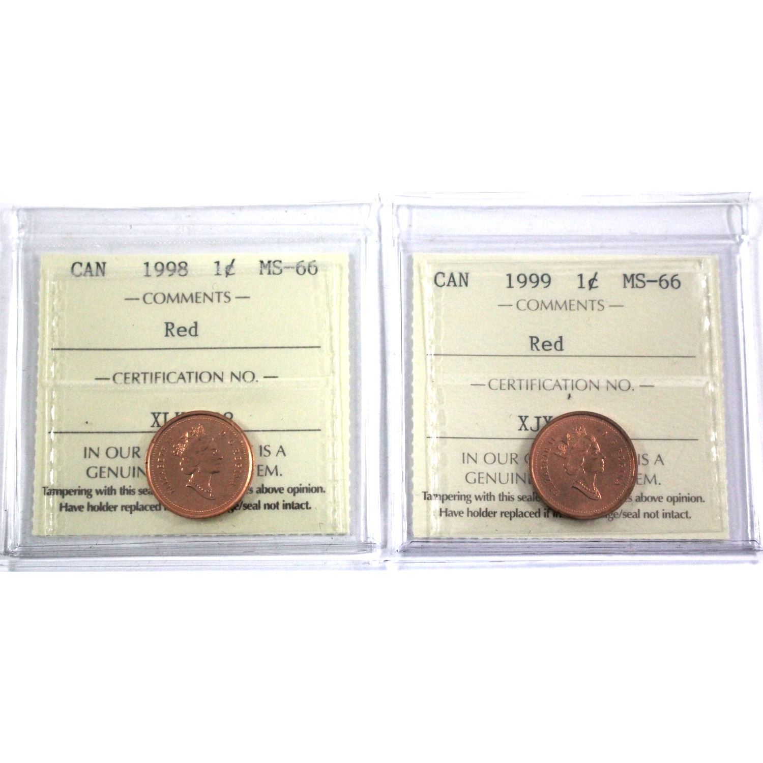 1998 & 1999 Canada 1-cent ICCS Certified MS-66 Red. 2pcs