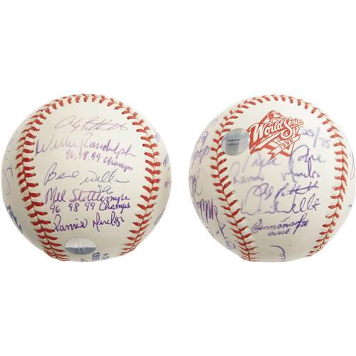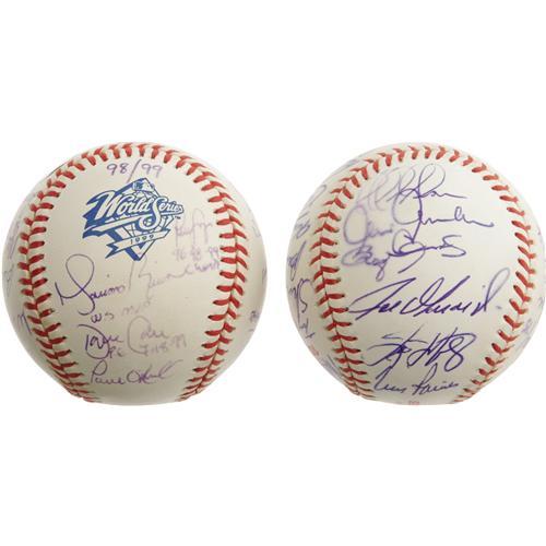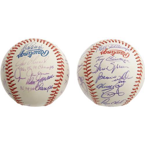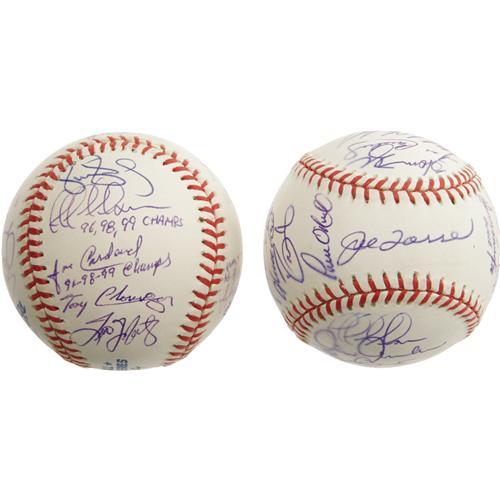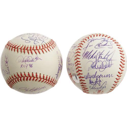 <B>1998 & 1999 New York Yankees Team Signed Baseballs.</B></I> Ah, those happy days when it seemed like World Championships grew like Big Apples on a tree. Along with their late 1920's counterparts, the late 1990's Yanks will go down in history as one of the greatest teams of all time. Double up on the magic with this pair of World Series baseballs signed by the likes of Jeter, Torre, O'Neill, Clemens, Pettitte, Ribera, Martinez, Strawberry, Posada, El Duke and many more. The '98 sphere derives from a limited edition of seventy-five, and offers twenty-six autographs. The '99 ball has twenty autographs, from a limited edition of ninety-nine. This ball also offers many notations with the signatures, with almost all referencing past Championships. Each ball shows a bit of "hazing" of signatures on certain panels, but the average strength overall is easily 9/10. Your grandchildren will thank you one day when they look back on this team as we do on the old Murderer's Row. <I>LOA from PSA/DNA.</B></I> <BR><BR><B>Important notice:</B> Heritage usually auctions material at the rate of 200-250 lots per hour. On some occasions eBay Live bid software or the Internet may not be able to keep up with the pace of the auction. We recommend placing a realistic absentee bid now as insurance to avoid disappointment. Occasionally the auctioneer may eliminate or reject an eBay Live bid, and the auctioneer may also reopen a lot after the close of the eBay live bidding (usually because we missed an audience bid), and may reject your bid even if it shows you as the winning bidder. By bidding via eBay Live, you agree that Heritage may award the lot to another bidder at its sole discretion under the circumstances described above or any other reasonable circumstances. Since eBay bids are not shown to us until we open the lot on the floor, we treat those bids just like floor bids. In most cases the floor responds before the eBay bid is presented to us, due to Internet lag time, so for consistency we have made it a policy that floor bids are always considered first over tie eBay live bids. Also please note that all Heritage lots purchased through eBay Live carry a 22.5% Buyer's Premium. Please make sure you read the Terms and Conditions before you bid. This lot is being auctioned in conjunction with a live floor auction by Heritage Galleries & Auctioneers. All final auction and invoice information will be supplied by Heritage Galleries & Auctioneers, and all other information should be considered preliminary. Lot:19424 <BR><BR><B>Winning Notification and Billing:</B> After the FINAL session in this auction is complete, Heritage will send e-mail and snail mail invoices. This process normally takes several days. All final auction and invoice information will be supplied by Heritage Galleries & Auctioneers, and all other information should be considered preliminary. <BR><BR>This auction will be conducted on a live auction floor and over the Internet through eBay Live. If you choose to place an absentee bid, please take a moment to <font color='#0000ff'><u><a href='http://pages.ebay.com/liveauctions/help/before/laabsentee.html'>learn how eBay Live absentee bidding works</a></u></font><font color='#000000'>