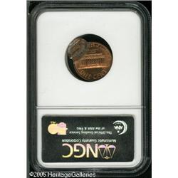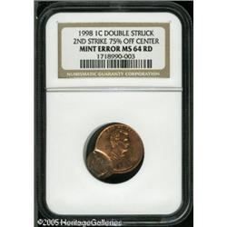 <B>1998 1C Lincoln Cent--Double Struck, Second Strike 75% Off Center--MS64 Red NGC.</B></I> The second strike is toward 1:30, and is centered at 7:30 relative to the initial strike. The first strike has a rim ding at 4 o'clock on the reverse, likely as made where the Cent was flush against a die during the second strike. Lot:10899