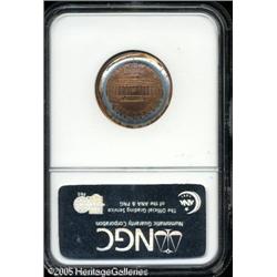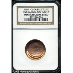 <B>1998 1C Lincoln Cent--Double Struck, Second Strike with 100% Obverse Indent--MS65 Red NGC.</B></I> Lustrous and attractive with brilliant orange color and a ring of gray color on the reverse from the underlying zinc core. Lot:10906