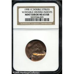 <B>1998 1C Lincoln Cent--Double Struck with Double Obverse Indents--MS65 Red NGC.</B></I> Parts of two different planchets lay on top of this when the second strike occurred. Brilliant orange mint color with considerable zinc-gray. Lot:10904