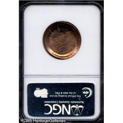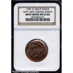 <B>1998 1C Lincoln Cent--Multiple Struck with 100% Obverse Indent--MS65 Red NGC.</B></I> As this was being struck, and struck, and struck again, a planchet on the obverse caused the obverse design to expand and distort. At least three and possibly more strikes were involved when this was mis-produced. Lot:10901