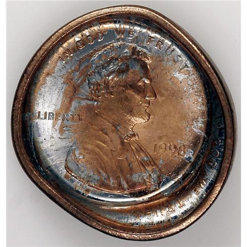 <B>1998 Lincoln Cent--Obverse Die Cap--MS66 Red NGC.</B></I> Continuous blows leave portions of the design on the sides of the expanded planchet. Argent-gray color from the zinc interior is distributed throughout. Always a dramatic and fascinating error.