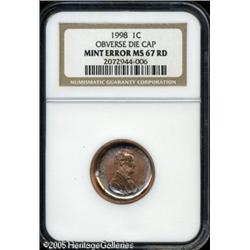 <B>1998 1C Lincoln Cent--Obverse Die Cap--MS67 Red NGC.</B></I> A deep die cap with an expanded brockage image on the reverse. Lustrous and attractive with brilliant orange and gray color. Lot:10919