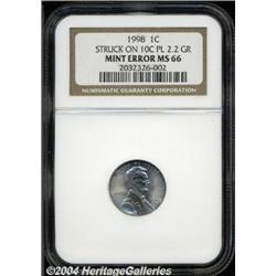 <B>1998<1C> Lincoln Cent--Struck on 10C Planchet--MS66 NGC.</B></I> Weight: 2.2. grams. Booming luster and light golden-brown patina ensure the eye appeal of this sharply struck and impressive wrong planchet error. <BR><BR><B>Important notice:</B> Heritage usually auctions material at the rate of 200-250 lots per hour. On some occasions eBay Live bid software or the Internet may not be able to keep up with the pace of the auction. We recommend placing a realistic absentee bid now as insurance to avoid disappointment. Occasionally the auctioneer may eliminate or reject an eBay Live bid, and the auctioneer may also reopen a lot after the close of the eBay live bidding (usually because we missed an audience bid), and may reject your bid even if it shows you as the winning bidder. By bidding via eBay Live, you agree that Heritage may award the lot to another bidder at its sole discretion under the circumstances described above or any other reasonable circumstances. Since eBay bids are not shown to us until we open the lot on the floor, we treat those bids just like floor bids. In most cases the floor responds before the eBay bid is presented to us, due to Internet lag time, so for consistency we have made it a policy that floor bids are always considered first over tie eBay live bids. Also please note that all Heritage lots purchased through eBay Live carry a 20% Buyer's Premium. Please make sure you read the Terms and Conditions before you bid.