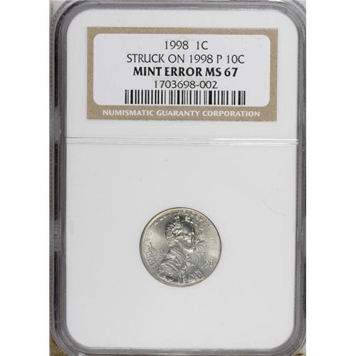 1998 1C Lincoln Cent--Struck on a 1998-P Dime--MS67 NG
