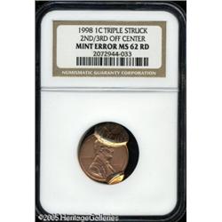 <B>1998 1C Lincoln Cent--Triple Struck, Second and Third Strikes Off Center--MS62 Red NGC.</B></I> The second and third strikes are each off center, one 80% off-center at 6 o'clock and the other about 95% off-center at 10 o'clock. Bright orange with subdued luster. Lot:10897