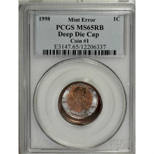 <B>1998 1C Lincoln Cent Mated Error Pair PCGS.</B></I> The lot includes <B>coin #1--Deep Die Cap--MS65 Red and Brown;</B></I> and <B>coin #2--Cupped Brockage--MS65 Red and Brown.</B></I> Coin #1 stuck to the obverse die after its first strike. It then rotated nearly 180 degrees clockwise between strikes, and a new planchet was fed in, to become coin #2. Coin #2 was struck between the reverse die and coin #1, and the obverse received a brockage impression from the reverse of coin #1.<BR><BR><b>Shipping:</b> Coins & Currency (<a target="_blank" href="http://www.heritageauctions.com/common/shipping.php">view shipping information</a>)