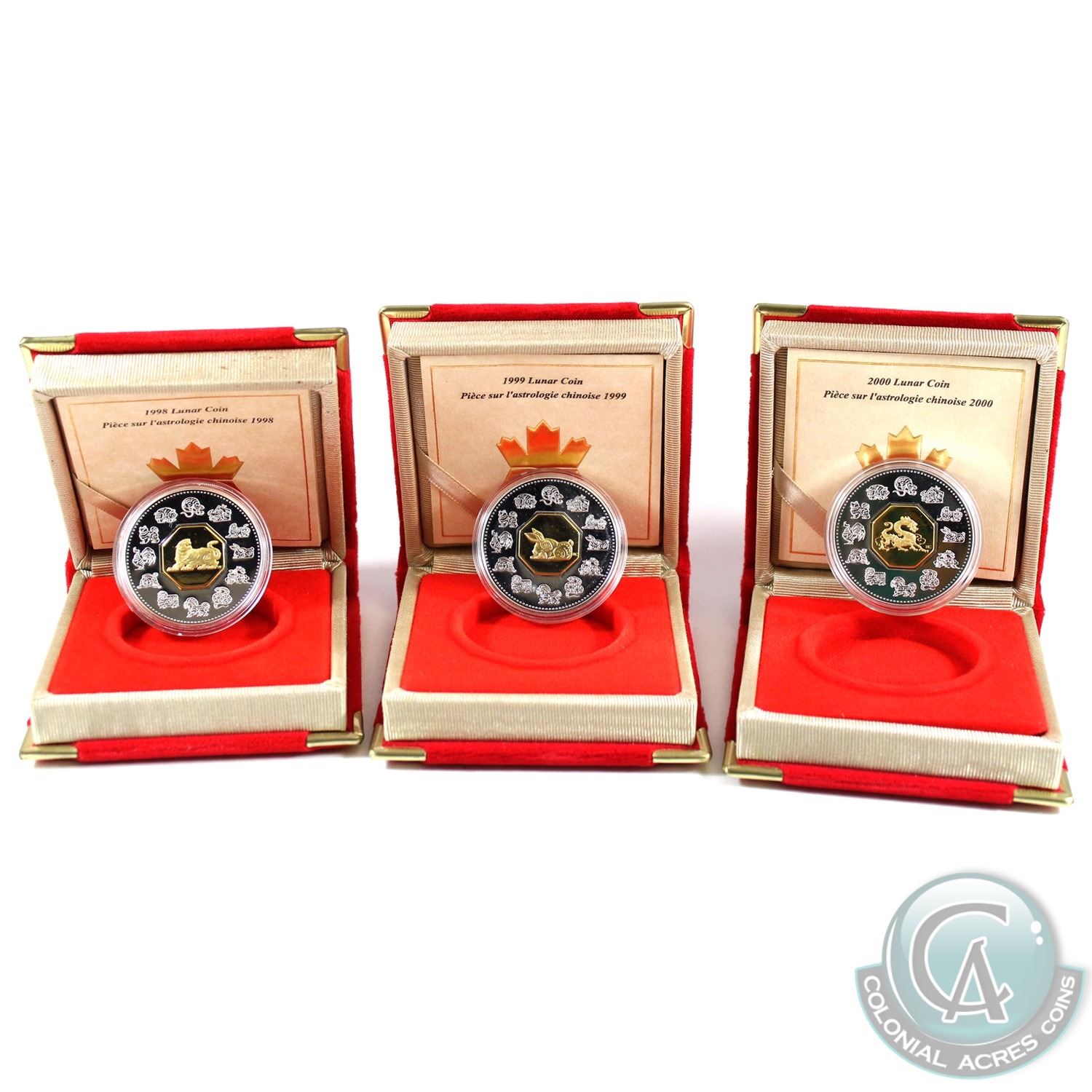 1998-2000 $15 Lunar Silver/Gold Coin: 1998 Tiger, 1999 Rabbit & 2000 Dragon. Coins come encapsulated with display box and certificate. Capsules are scratched however, the coins remains intact.