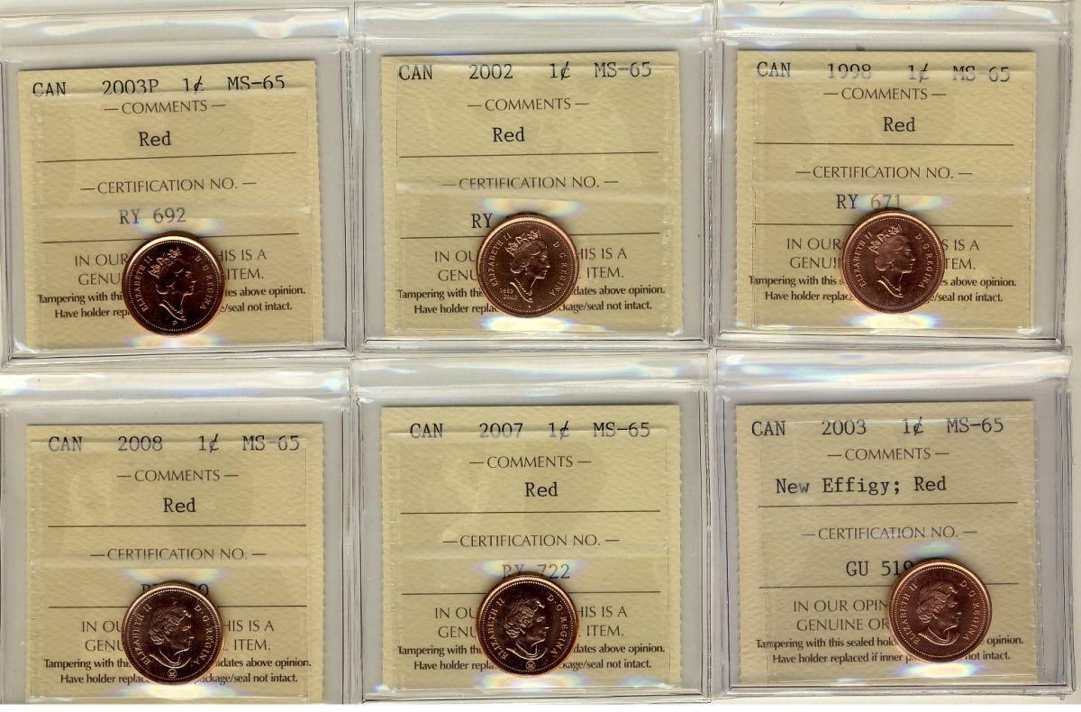1998, 2002, 2003P, 2003 New Effigy, 2007, 2008, 1¢ ICCS MS65 Red, Lot of 6 coins,